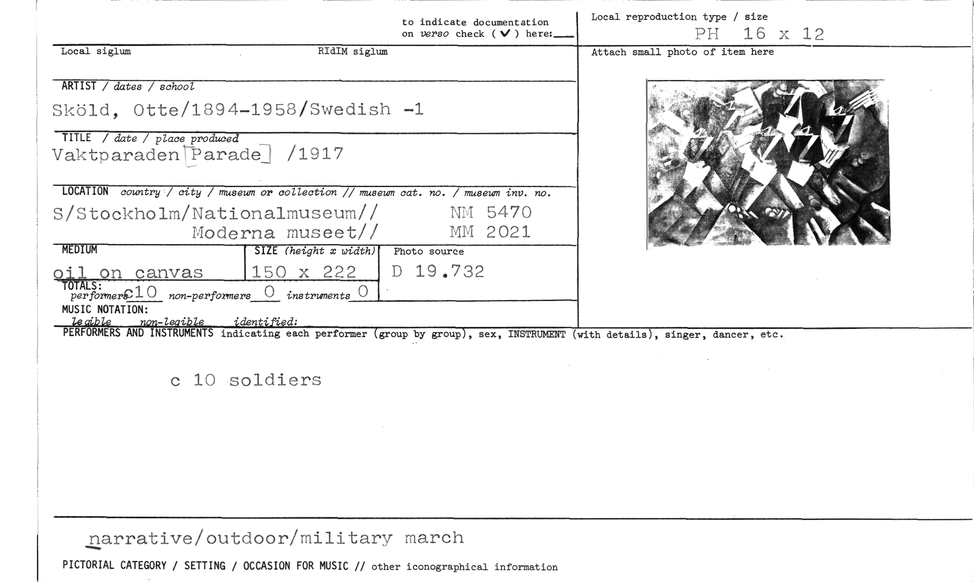 //// to indicate documentation //// on verso check (V ) here:_ //// Local reproduction type / size //// PH 16 x 12 //// Local siglum RIdIM siglum //// ARTIST / dates / school //// Sköld, Otte/1894-1958/Swedish -1 //// TITLE / date / place produced //// VaktparadenrParadej /1917 //// LOCATION country / city / museum or collection // museum cat. no. / museum im). no. //// S/Stockholm/Nationalmuseum// NM 5470 //// Moderna museet// MM 2021 //// MEDIUM //// 07 L on canvas //// T ÄLS: //// per forrner,01() non-perfonners 0 instruments 0 //// SIZE (height x width) //// 150 x 222 //// Photo source //// D 19.732 //// Attach small photo of item here //// MUSIC NOTATION: //// lecible non-leaible identified: //// PERFORMERS AND INSTRUMENTS indicating each performer(xoup by group), sex, INSTRUMENT //// c 10 soldiers //// (with details), singer, dancer, etc. //// narrative/outdoor/military march //// PICTORIAL CATEGORY / SETTING / OCCASION FOR MUSIC // other iconographical information ////