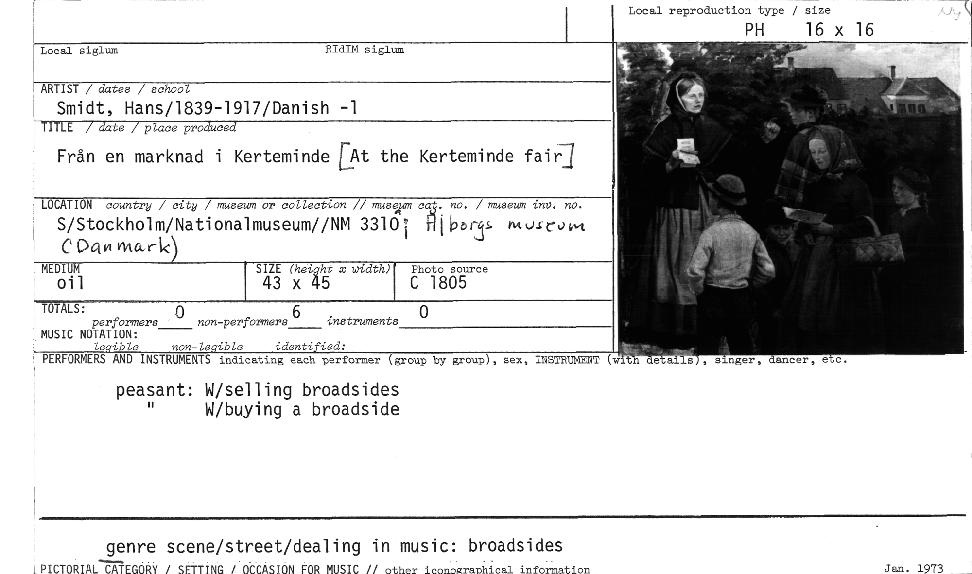 //// Local reproduction type / size //// PH 16 x 16 //// Local siglum RIdIM siglum .. //// .,. //// ARTIST / dates / school //// Smidt, Hans/1839-1917/0anish -1 //// TITLE / date / place produced . //// ,- //// Från en marknad i Kerteminde LAt the Kerteminde fair.] //// LOCATION country / city / museum or collection // musee ca S. no. / museum inv. no. . //// S/Stockholm/Nationalmuseum//NM 3310i Hil9bT mulrom //// C 04H vviark) //// MEDIUM SIZE (heightx width) 43 x 45 Photo source //// oil 6 C 1805 0 //// instruments //// TIIT'LS: 0 //// performers non-performers //// MUSIC NOTATION: //// legible non-legible //// identified: //// PERFORMERS AND INSTRUMENTS indicating each performer (group by group), sex, INSTRUMENT (with aåtails , singer, dancer, etc. //// peasant: W/selling broadsides W/buying a broadside //// genre scene/street/dealing in music: broadsides //// IPICTORIAL CATEGORY / SETTING / OCCASION FOR MUSIC // other iconoRrapLical information Jan. 1973 _ ////