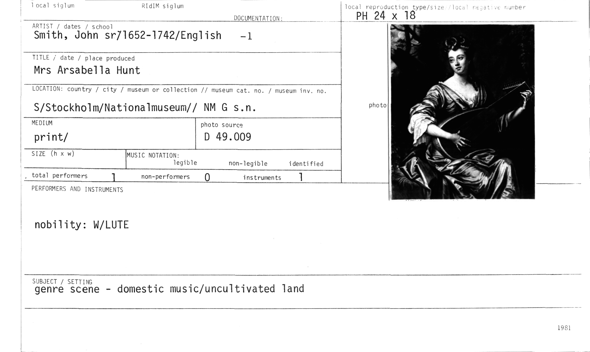 //// lotal siglum RIdIM siglum //// DOCUMENTATION: //// ARTIST / dates / school //// Smith, John sr71652-1742/English —1 //// TITLE / date / place produced //// Mrs Arsabella Hunt //// LOCATION: country / city / museum or collection // museum cat. no. / museum inv. no. //// S/Stockholm/Nationalmuseum// NM G s.n. //// MEDIUM //// print/ //// SIZE (h x w) //// non-legible identified //// total performers 1 non-performers 0 instruments 1 //// PERFORMERS AND INSTRUMENTS //// MUSIC NOTATION: //// legible //// photo source //// D 49.009 //// lotal reproduction type/size:/local negative noter //// PH 24 x 18 //// photo //// nobility: W/LUTE //// SUBJECT / SETTING //// genre scene - domestic music/uncultivated land //// 1981 ////