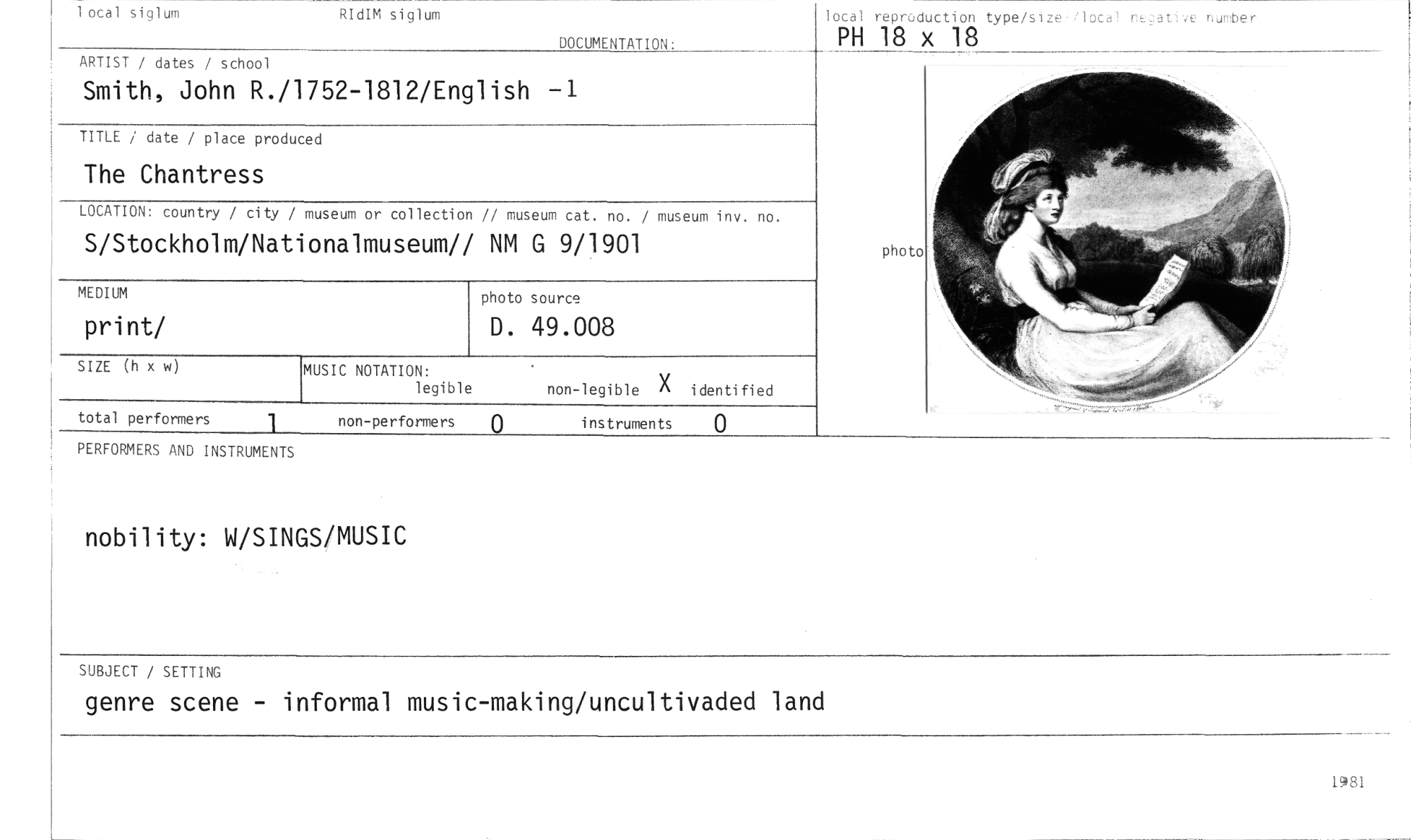 //// l ocal siglum RIdIM siglum //// DOCUMENTATION: //// ARTIST / dates / school //// Smith, John R./1752-1812/English -1 //// TITLE / date / place produced //// The Chantress //// LOCATION: country / city / museum or collection // museum cat. no. / museum inv. no. //// S/Stockholm/Nationalmuseum// NM G 9/1901 //// MEDIUM //// print/ //// SIZE (h x w) //// lotal reproduction type/size /lots'; regat.ve number //// PH 18 x 18 //// MUSIC NOTATION: //// legible non-legible X identified //// photo source //// D. 49.008 //// total performers 1 non-performers instruments 0 //// PERFORMERS AND INSTRUMENTS //// nobility: W/SINGS/MUSIC //// SUBJECT / SETTING //// genre scene - informal music-making/uncultivaded land //// 1981 ////