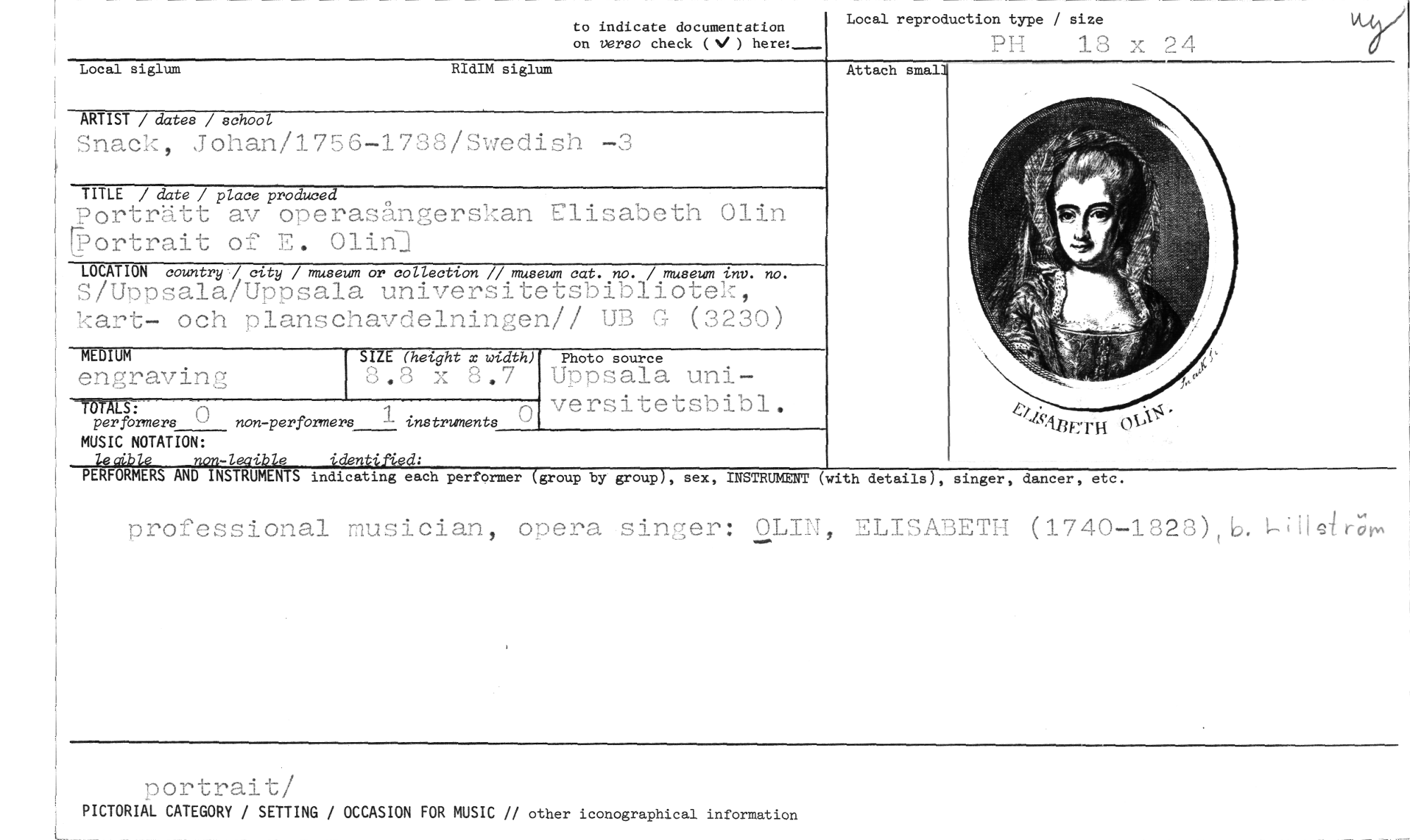 //// to indicate documentation //// on versa check (V) here:___ //// Local reproduction type / size //// PH 13 x 24 //// Local siglum RIdIM siglum //// ARTIST / datea / school //// Snack, Johan/1756-1788/Swedish -3 //// TITLE / date / place produced //// Porträtt av operasångerskan Elisabeth Olin 5ortrait of E. Olin-] //// LOCATION country" city / museum or collection // museum cat. no. / museum tnv. no. //// S/Uppsala/Uppsala universitetsbibliotek, kart- och planschavdelningen// UB G (3230) //// MEDIUM //// engraving //// =ALS: //// per formera non-perfbrmers 1 instruments //// MUSIC NOTATION: //// lqcib/e non-leaible identified: //// PERFORMERS AND INSTRUMENTS indicating each performer (group by group), sex, INSTRUMENT //// (with details), singer, dancer, etc. //// SIZE (height x width) //// 8.8 x 8.7 //// 0 //// Photo source //// Uppsala universitetsbibl. //// Attach smal //// professional musician, opera singer: GLIN, ELISABETH (1740-1828),i9.1-ilhdr4, //// portrait/ //// PICTORIAL CATEGORY / SETTING / OCCASION FOR MUSIC // other iconographical information ////