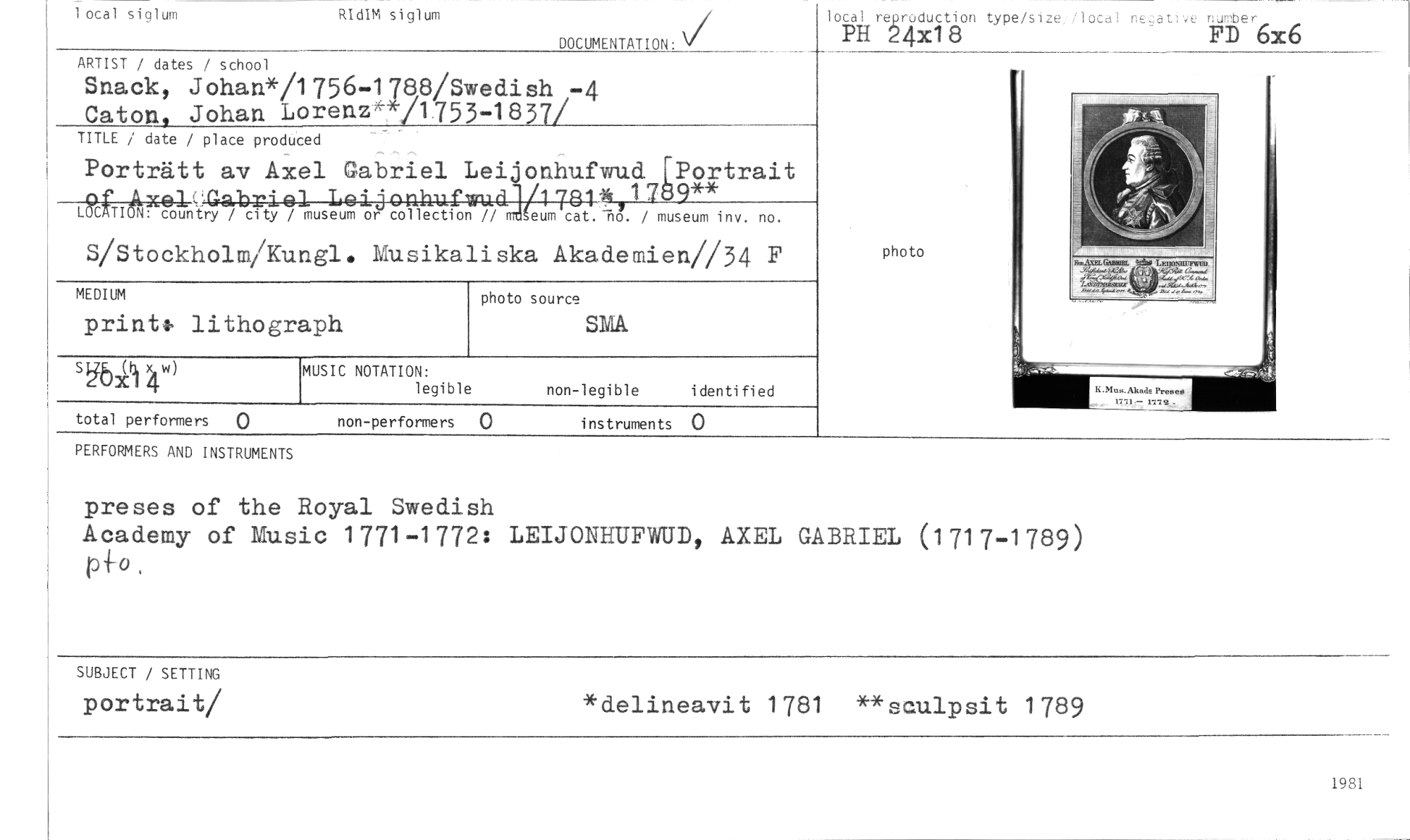 //// 1981 //// non-performers 0 instruments 0 //// 0 //// total performers //// MEDIUM //// printf lithogr //// aph //// MUSIC NOTATION: //// legible //// non-legible identified //// photo //// SUBJECT / SETTING //// portrait/ //// *delineavit 1781 **sculpsit 1789 //// local siglum RIdIM siglum //// DOCUMENTATION: i //// 6x6 //// ARTIST / dates / school //// Snack, Johan*/1756-1788/Swedish -4 //// Caton, Johan Lorenz*/1753-1837/ //// photo source //// SNIA. //// PERFORMERS AND INSTRUMENTS //// preses of the Royal Swedish //// Academy of Music 1771-1772: LEIJONHUFWUD, AXEL GABRIEL (1717-1789) //// p+o, //// local reproduction type/size //// PH 24x18 //// TITLE / date / place produced //// Porträtt av Axel //// 1.5gri6Vc'Atry / city / //// S/Stockholm/Ku //// ngl. Musikaliska Akademien//34 F //// Leijonhufwud [Portrait //// 1 //// 4.1r 7 9** //// museum or collection•//•ms eum cat. TiI. / museum inv. no. //// Gabriel ////
