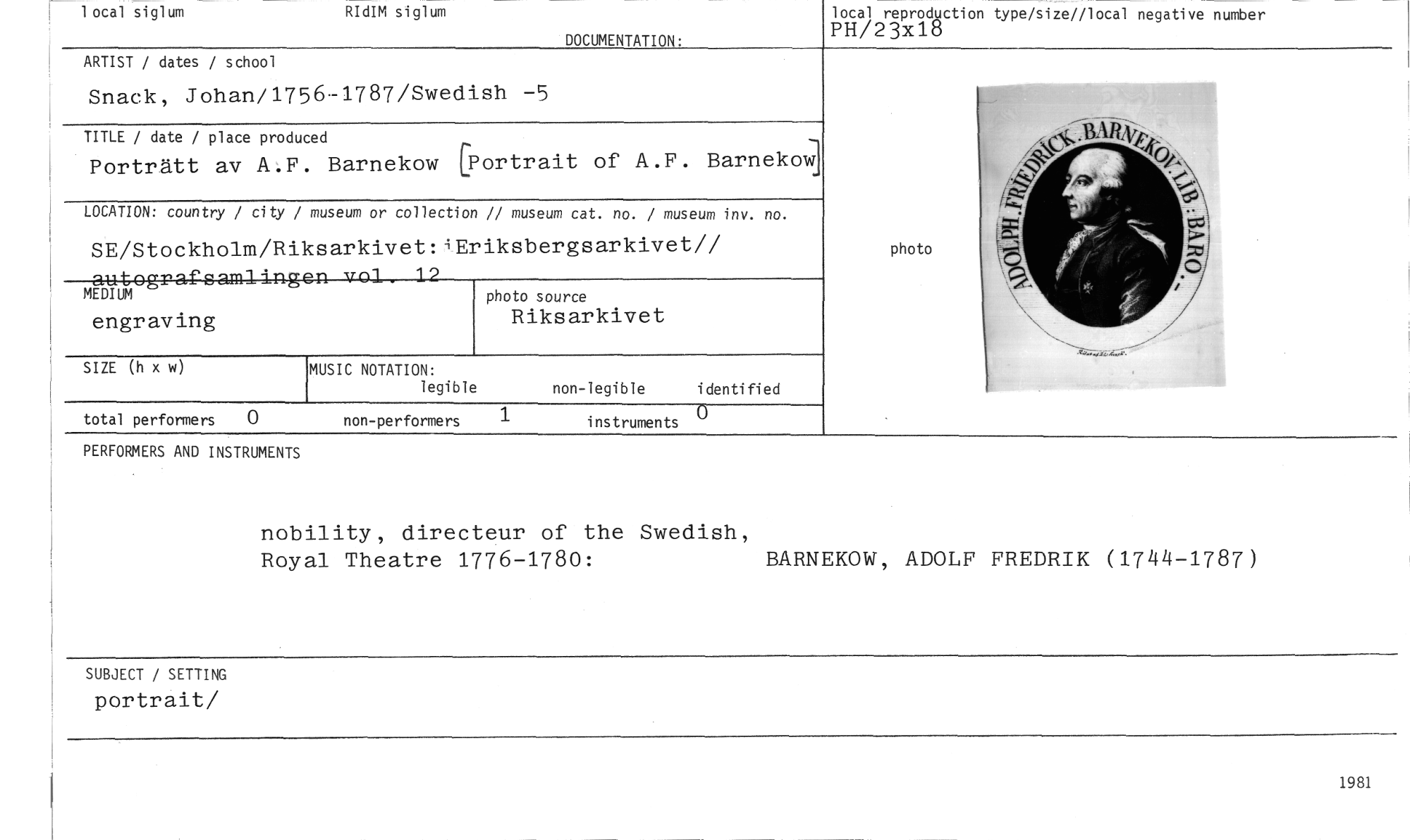 //// 1981 //// photo //// non-performers //// instruments 0 //// total performers 0 //// 1 ocal siglum //// RIdIM siglum //// DOCUMENTATION. //// local reproduction type/size//local negative numer //// PH/23x18 //// ARTIST / dates / school //// Snack, Johan/1756•1787/Ewedish —5 //// TITLE / date / place produced //// Porträtt av A.F. Barnekow (Portrait of A.F. Barnekow //// LOCATION: country / city / museum or collection // museum cat. no. / museum inv. no. //// SE/Stockholm/Riksarkivet:iEriksbergsarkivet// autografsamlingen vol. 19 //// MEDIUM //// engraving //// SIZE (h x w) //// non-legible identified //// photo source //// Riksarkivet //// MUSIC NOTATION: //// legible //// PERFORMERS AND INSTRUMENTS //// nobility, directeur of the Swedish, //// Royal Theatre 1776-1780: BARNEKOW, ADOLF FREDRIK (1744-1787) //// SUBJECT / SETTING //// portrait/ ////