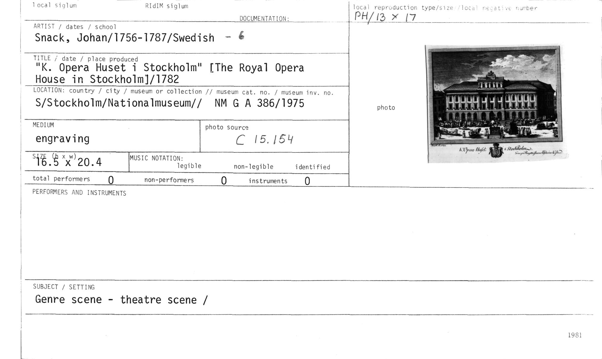 //// lotal siglum RIdIM siglum //// DOCUMENTATION: //// ARTIST / dates / school //// Snack, Johan/1756-1787/Swedish 4 //// TITLE / date / place produced //// "K. Opera Huset i Stockholm" [The Royal Opera House in Stockholm]/1782 //// LOCATION: country / city / museum or collection // museum cat. no. / museum inv. no. //// S/Stockholm/Nationalmuseum// NM G A 386/1975 //// photo source //// C 15.169 //// Tå:g xxw)20.4 //// MEDIUM //// engraving //// MUSIC NOTATION: //// legible //// non-legible identified //// lotal repruduction type/sizeflocal ne_ac ve nurober //// PH/13 x 17 //// photo //// total performers O non-performers Q instruments O //// PERFORMERS AND INSTRUMENTS //// SUBJECT / SETTING //// Genre scene - theatre scene / //// 1981 ////