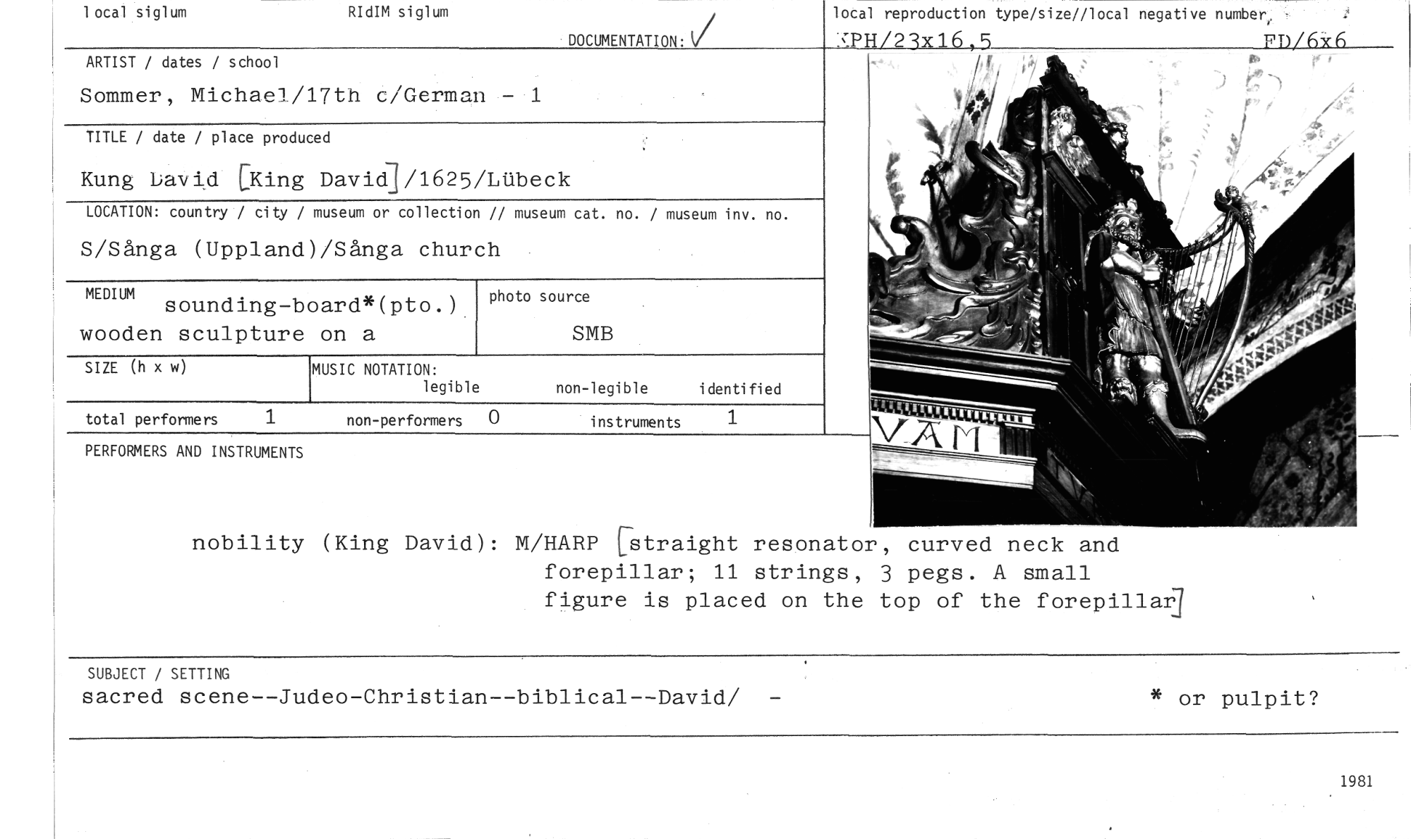 //// 1 ocal siglum RIdIM siglum DOCUMENTATION: lotal reproduction type/size//local negative numbert-7- //// SEHL2ax16„5 FD/6x6 //// //// ARTIST / dates / school //// Sommer, Michael/17th c/Ge.man - 1 //// TITLE / date / place produced //// Kung David [King Davidj/1625/LUbeck //// — i f , er, tr^ //// '.0"... //// LOCATION: country / city / museum or collection // museum cat. no. / museum inv. no. //// S/Sånga (Uppland)/Sånga church //// MEDIUM //// sounding-board*(pto.) wooden sculpture on a //// photo source //// SMB //// SIZE (h x w) //// MUSIC NOTATION: //// legible //// non-legible identified //// total performers 1 non-performers 0 //// PERFORMERS AND INSTRUMENTS //// instruments //// 1 //// nobility (King David): M/HARP btraight resonator, curved neck and forepillar; 11 strings, 3 pegs. A small //// figure is placed on the top of the forepillai] //// SUBJECT / SETTING * or pulpit? //// sacred scene--Judeo-Christian--biblical--David/ - //// 1981 ////