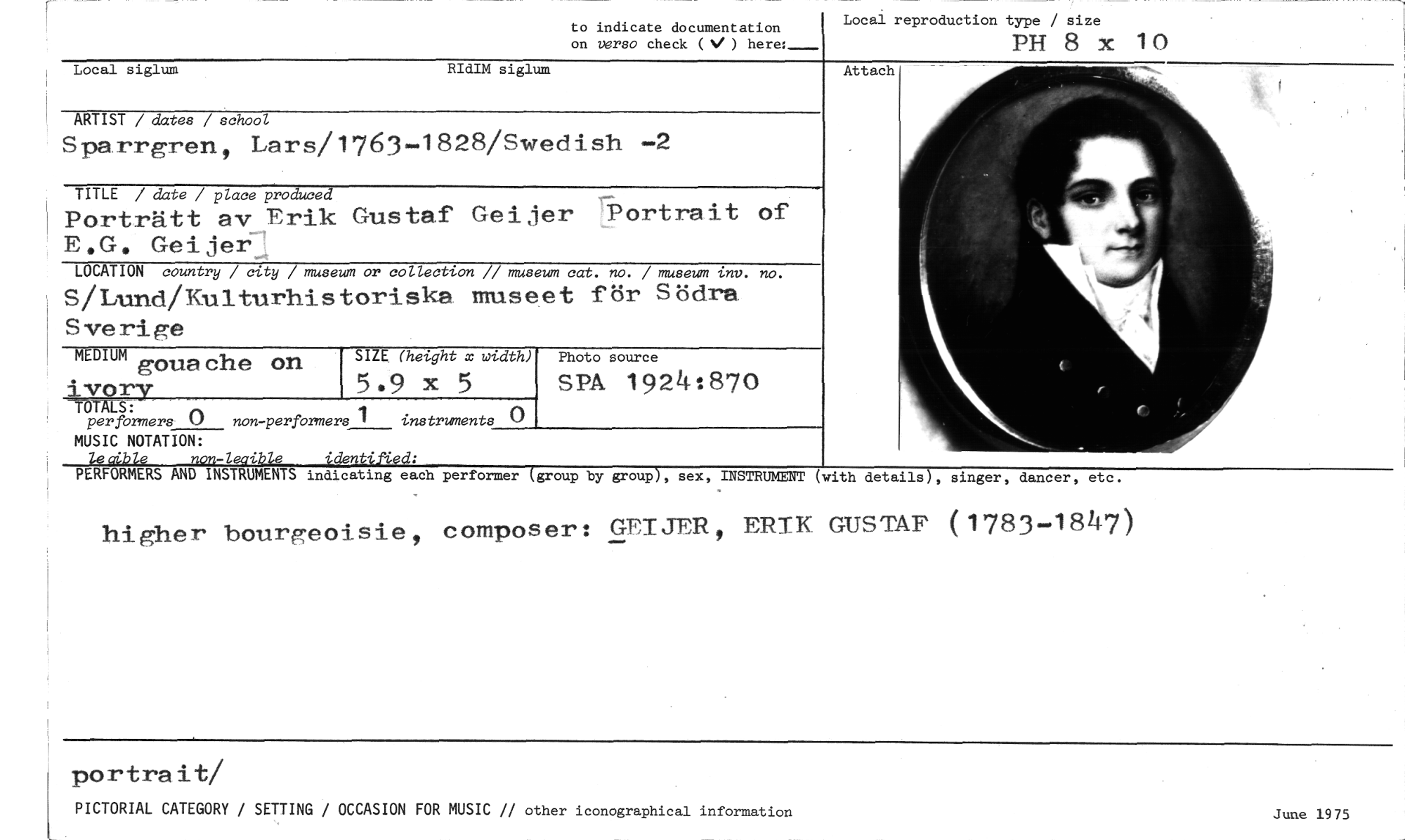 //// to indicate documentation on verso check ( ) here: //// Local reproduction type / size //// PH 8 x 10 //// Local siglum R dIM siglum //// ARTIST / dates / school //// Sparrgren, Lars/1763-1828/Swedish -2 //// TITLE / date / place produced //// Porträtt av Erik Gustaf Geijer Portrait of E.G. Geijer- //// LOCATION country / city / museum or collection // museum cat. no. / museum tnv. no. //// S/Lund/Kulturhistoriska museet för Södra. Sverige //// SIZE (hevght x width) //// 5.9 x //// LS: //// per formers- () non-performers 1 instruments () //// MUSIC NOTATION: //// lecible non-leaible identified; //// PERFORMERS AND INSTRUMENTS indicating each //// iv //// MEDIUM gouache on //// Photo source //// SPA 1924:870 //// Attach //// performer (group by group), sex, INSTRUMENT (with details), singer, dancer, etc. //// higher bourgeoisie, composer: GFTJER, ERIK GUSTAF (1783-1847) //// portrait/ //// PICTORIAL CATEGORY / SETTING / OCCASION FOR MUSIC // other iconographical information //// June 1975 //// ////