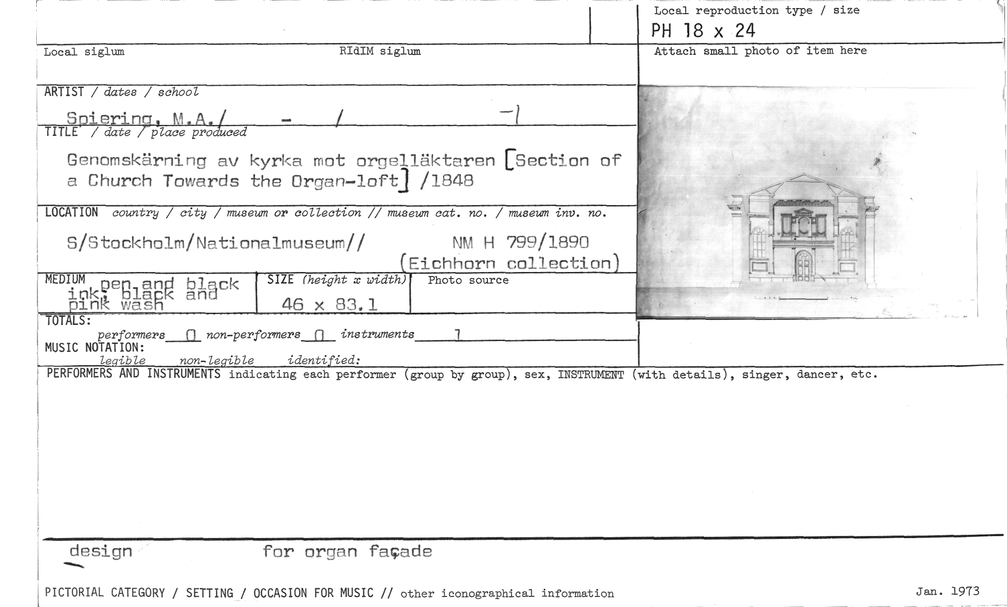 //// Local reproduction type / size //// PH 18 x 24 //// Attach small photo of item here //// Local siglum RIdIM siglum //// ARTIST / dates / school //// Spiering, M.A. //// TITLE / date / place proatced //// / -1 //// Genomskärning av kyrka mot orgelläktaren [Section of a Church Towards the Organ—loft] /1848 //// LOCATION country / city / museum or collection // museum cat. no. / museum imv. no. //// S/Stockholm/Nationalmuseum// NM H 799/1890 //// Eichhorn collection //// Tö //// MEDIUM //// inkCjeglaBg Unäck pinR wasri //// g . //// performers___0_ non-performers_a__instruments //// MUSIC NOTATION: //// le•ible non-le•ible identi ied: //// PERFORMERS AND INSTRUMENTS indicating each performer (group by group), sex, INSTRUMENT (with details), singer, dancer, etc //// design for organ fa4ade //// SIZE (height x width) //// 46 x 83.1 //// Photo source //// PICTORIAL CATEGORY / SETTING / OCCASION FOR MUSIC // other iconographical information ////