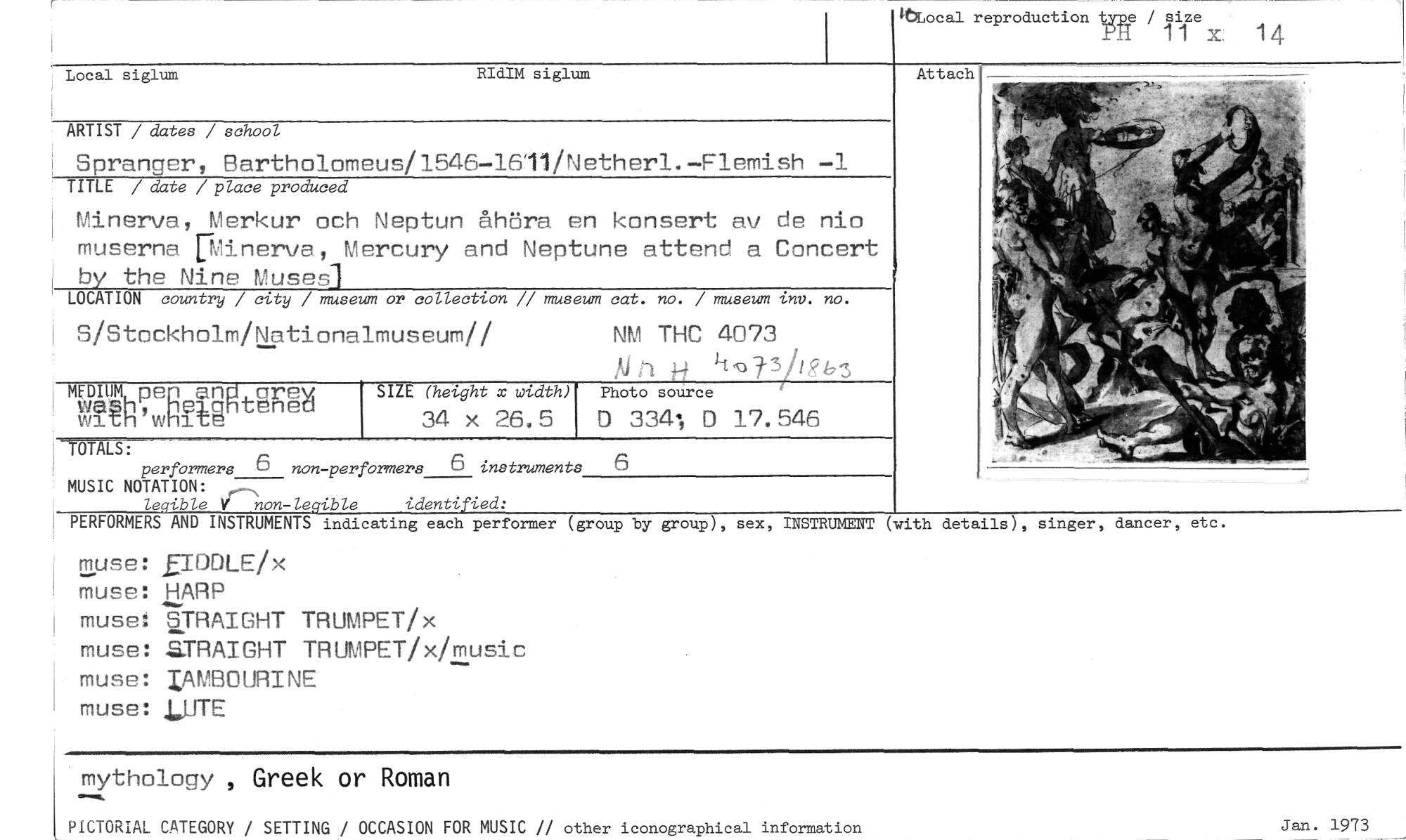 //// 4bLocal reproduction tgfr / r. //// fe //// x. 14 //// Local siglum RIdIM siglum //// ARTIST / dates / school //// Spranger, Bartholomeus/1646-1611/Nether1.-Flemish -1 //// TITLE / date / place produced //// Minerva, Merkur och Neptun åhöra en konsert av de nio muserna. L-Minerva, Mercury and Neptune attend a Concert by the Nine Musas] //// LOCATION country / city / museum or collection // museum cat. no. / museum inv. no. //// S/Stockholm/Nationalmuseum// NM THC 4073 //// !,J,1 //// MEDIUM pe and ore SIZE (height x width) Photo source //// waghn, isIgn mtsneo D 334, D 17.646 //// Mun wni-ce 34 x 26.5 //// //// TOTALS: performers 6 non-performers MUSIC NOTATION: //// Le ible V non-le•identi ied: //// PERFORMERS AND INSTRUMENTS indicating each performer (group by group), sex, INSTRUMENT (with details), singer, dancer, et //// muse: EIDDLE/x //// muse: HARP //// musetE7TRAIGHT TRUMPET/x //// muse: WRAIGHT TRUMPET/x/music muse: ZAMBOURINE //// muse: 1,11TE //// mythology , Greek or Roman //// PICTORIAL CATEGORY / SETTING / OCCASION FOR MUSIC // other iconographical information Jan. 1973 //// 6 instruments 6 //// Attach ////