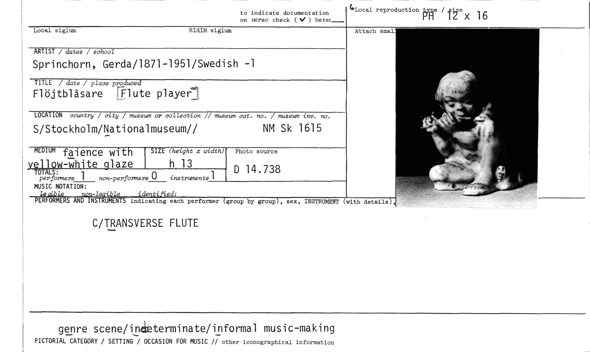 //// to indicate documentation //// on verso check ( V ) here:- //// `Local reproduction ge /1!e //// 1 x 16 //// Local siglum RIdIM siglum //// Attach smal //// ARTIST / dates / school //// Sprinchorn, Gerda/1871-1951/Swedish -1 //// TITLE / date / place produced //// Flöjtblåsare relute player-1 //// LOCATION country./ city / museum or collection // museum cat. no. / museum inv. no. //// S/Stockholm/Nationalmuseum// NM Sk 1615 //// MEDIUM faience with SIZE (height x width) Photo source //// y 11 w-white glaze h 13 //// T LS: //// per formers 1 non-performers 0 instruments] //// MUSIC NOTATION: //// lecible non-leaible ident'i,fied; //// PERFORMERS AND INSTRUMENTS indicating each performer (group by group), sex, INSTRUMENT (with details) //// D 14.738 //// C/TRANSVERSE FLUTE //// genre scene/inåbterminate/informal music-making //// PICTORIAL CATEGORY / SETTING / OCCASION FOR MUSIC // other iconographical information ////