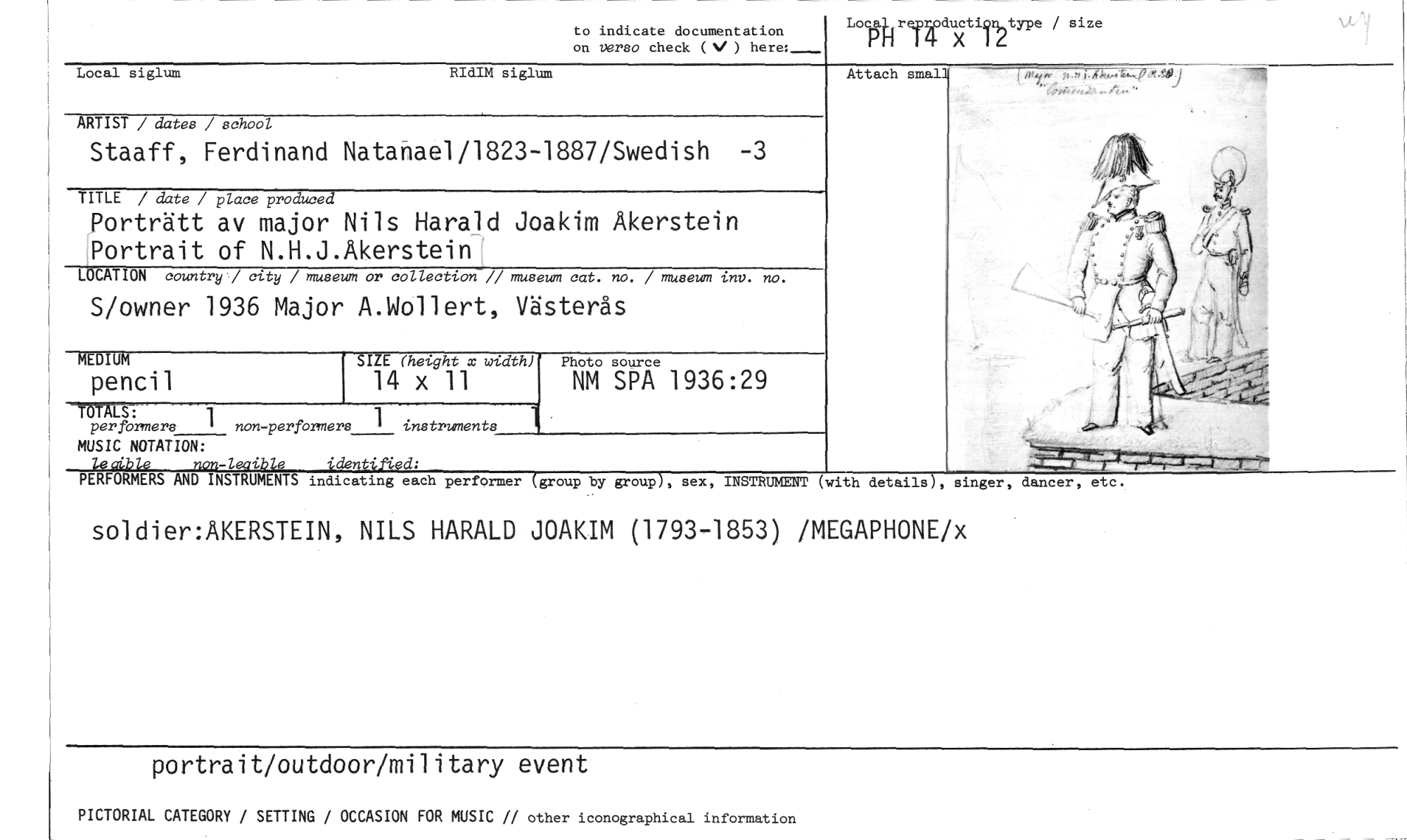 //// to indicate documentation //// on versa check ( ) here:- //// Loptirepspducti"type / size P+ X IL //// Local siglum RIdIM siglum //// ARTIST / dates / school //// Staaff, Ferdinand Natahae1/1823-1887/Swedish -3 //// TITLE / date / place produced //// Porträtt av major Nils Harald Joakim Åkerstein Portrait of N.H.J.Åkerstein //// LOCATION country / city / museum or collection // museum cat. no. / museum inv. no. //// S/owner 1936 Major A.Wollert, Västerås //// Photo source 1 93 6 :29 //// TOTALS: //// per formers 1 non-perfbrmers 1 instruments //// MUSIC NOTATION: //// non-leaible ident¢fi d: //// PERFORMERS AND INSTRUMENTS indicating BachrtOrmergx•mroup, sex, //// mu pencil //// 51 E (height x uidth) //// 14 x 11 //// Attach small //// INSTRUMENT (with details), singer, dancer, etc. //// soldier:ÅKERSTEIN, NILS HARALD JOAKIM (1793-1853) /MEGAPHONE/x //// portrait/outdoor/military event //// PICTORIAL CATEGORY / SETTING / OCCASION FOR MUSIC // other iconographical information ////