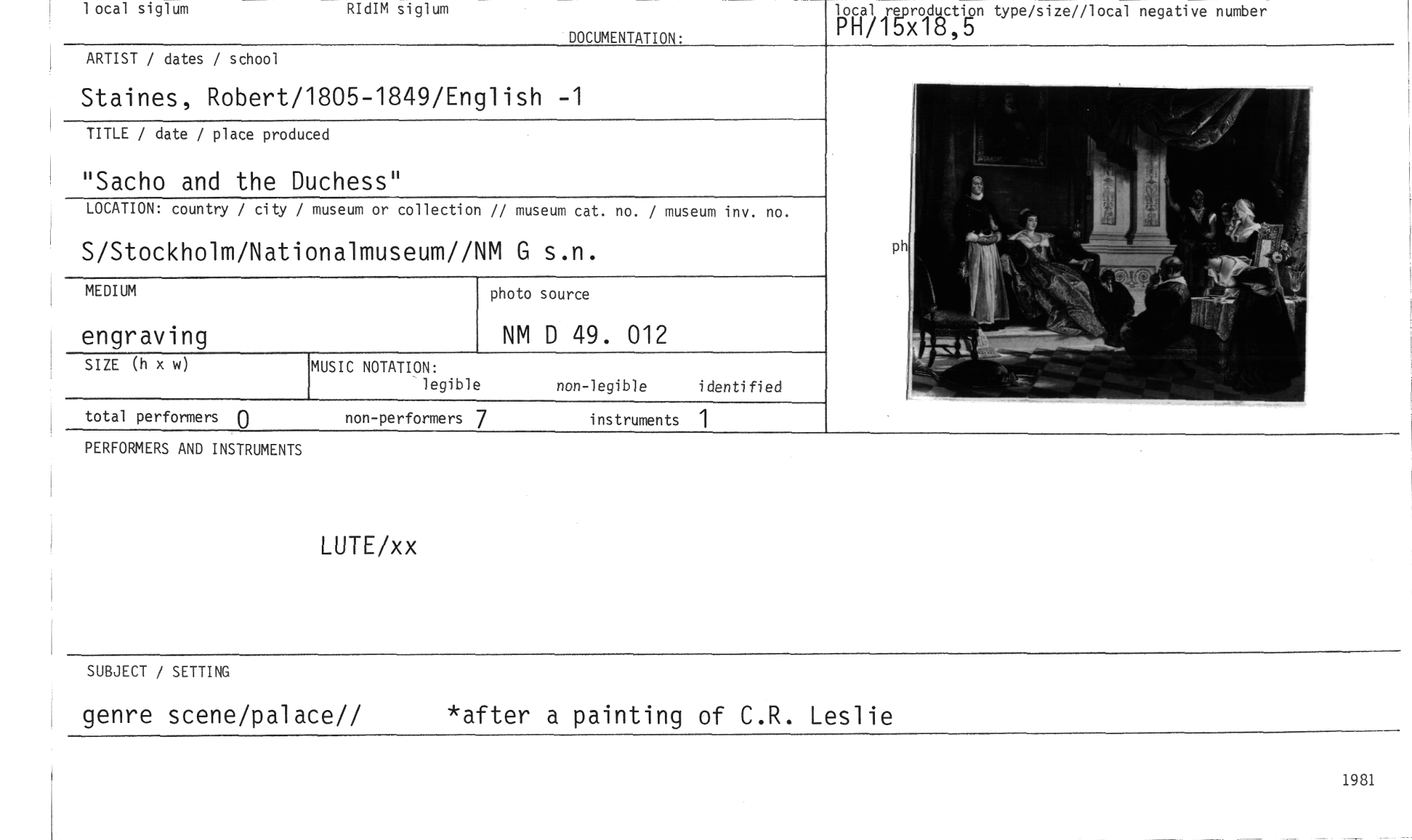 //// 1 ocal siglum RIdIM siglum //// DOCUMENTATION: //// PH local repro /15x18 duc5tion type/size//local negative number //// ARTIST / dates / school //// Staines, Robert/1805-1849/English -1 //// TITLE / date / place produced //// "Sacho and the Duchess" //// LOCATION: country / city / museum or collection // museum cat. no. / museum inv. no. //// S/Stockholm/Nationalmuseum//NM G s.n. //// photo source //// NM D 49. 012 //// SIZE (h x //// non-legible identified //// MEDIUM //// engraving //// MUSIC NOTATION: //// legible //// ph //// total performers non-performers 7 instruments //// PERFORMERS AND INSTRUMENTS //// LUTE/xx //// SUBJECT / SETTING //// genre scene/palace// *after a painting of C.R. Leslie //// 1981 ////