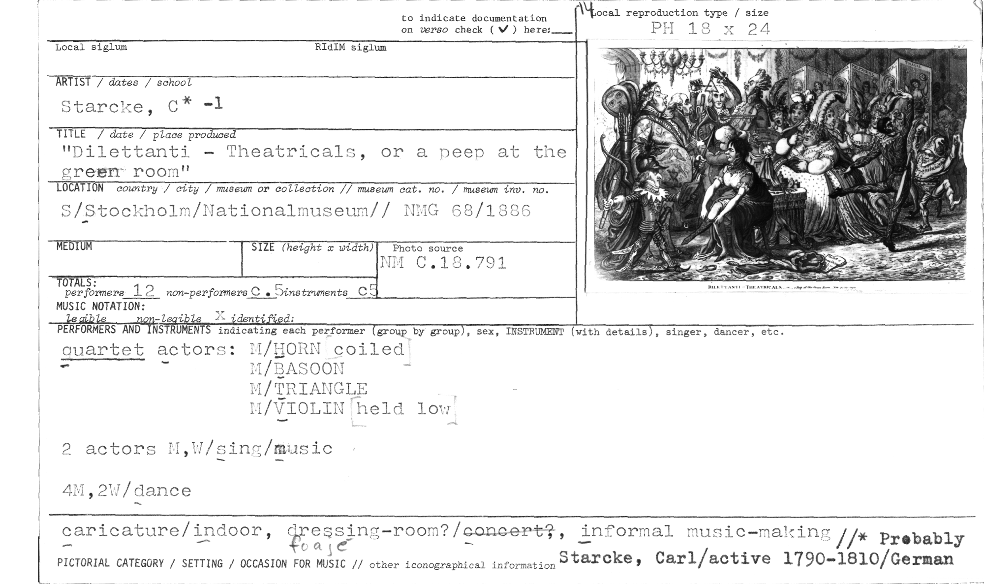 //// to indicate documentation nocal reproduction type / size //// on verso check (V) PH 18 24 //// Local siglum RIdIM siglum //// ARTIST / dates / school //// Starcke, c* -1 //// TITLE / date / place produce //// "Dilettanti Theatricals, or a peep at the //// green-room" //// LOCATION country' city `museum or collection // museum cat. no. / museum inv. no. //// S/Stockholm/Nationalmuseum// NMG 68/1886 //// MEDIUM SIZE (hetght x width) //// TOTÄLS: //// perfbnners 12 non-performers C Sinstruments //// MUSIC NOTATION: //// 4a9ible non-leditele identified: //// PE FORMERS AND INSTRUMENTS indicating each performer (-group by group), sex, //// quartet actors: III/HORN coiled //// M/BASOON //// M/TRIANGLE //// i` I/VI0EHT hell //// 2 actors M,W/sing/music 4M,2W/dance //// caricature/indoor,4res eing-room?/Q.Panp,ect.;, informal music-making/PF Probably tectlr //// Starcke, Carl/active 1790-1810/German //// PICTORIAL CATEGORY / SETTING / OCCASION FOR MUSIC // other iconographical information //// Photo source //// NM C•18.791 //// INSTRUMENT (with //// details), singer, dancer, etc. ////