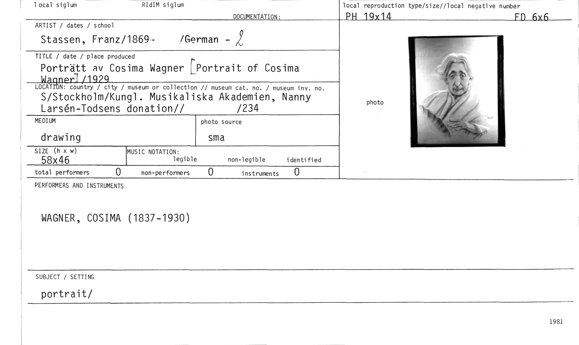 //// local siglum RIdIM siglum //// DOCUMENTATION. //// local reproduction type/size//local negative number //// PH 19x14 Ffl 6x6 //// ARTIST / dates / school //// Stassen, Franz/1869- /German - //// TITLE / date / place produced //// Porträtt av Cosima Wagner LPortrait of Cosima //// Wanner7/1q2g //// LOCATION: country / city / museum or collection // museum cat. no. / museum inv. no. //// S/Stockholm/Kungl. Musikaliska Akademien, Nanny Larsk-Todsens donation// /234 //// photo source //// drawing //// MEDIUM //// sma //// photo //// MUSIC NOTATION: //// legible //// non-legible identified //// SIZE (h x w) //// 58x46 //// total performers 0 non-performers 0 instruments 0 //// PERFORMERS AND INSTRUMENTS //// WAGNER, COSIMA (1837-1930) //// SUBJECT / SETTING //// portrait/ //// 1981 ////