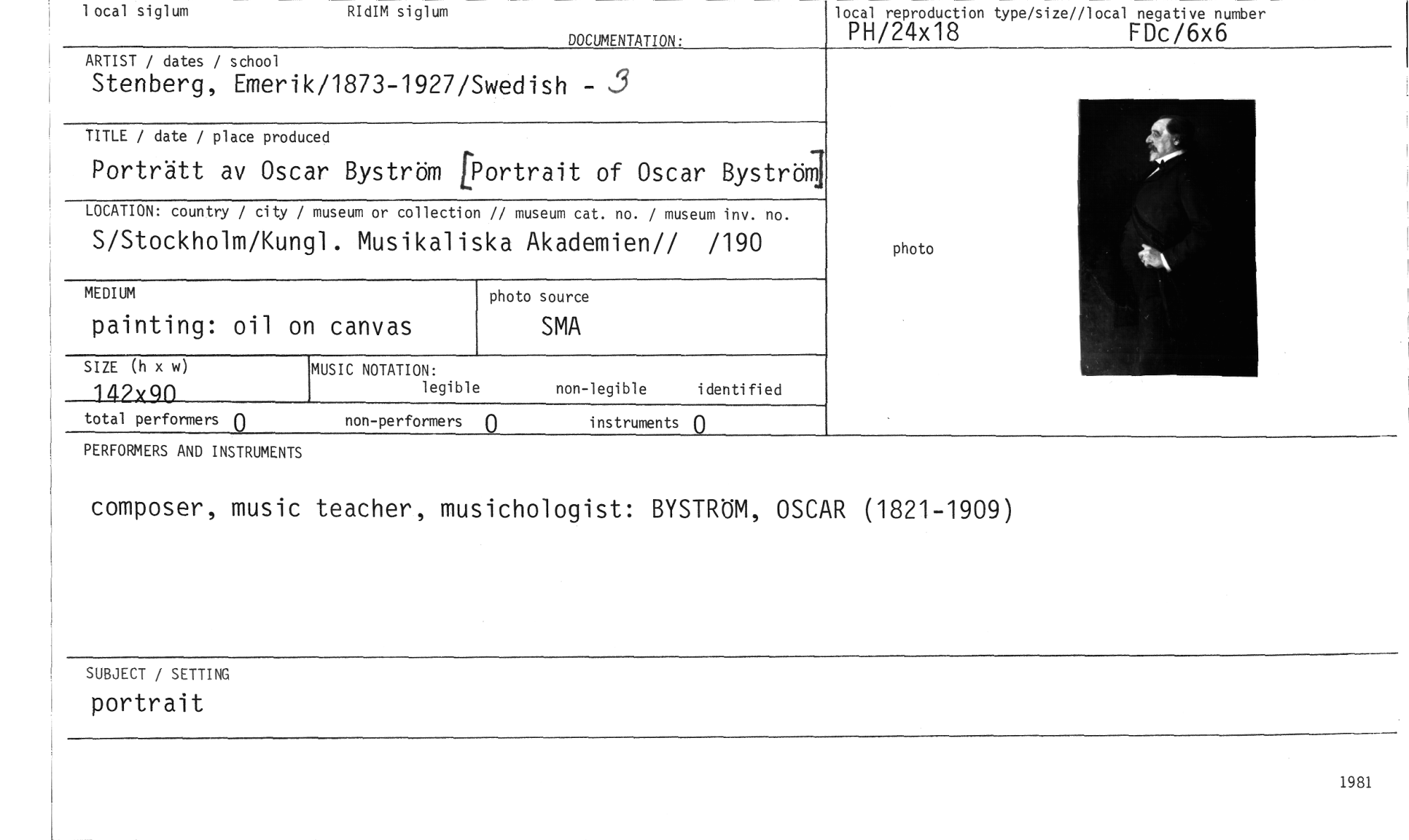 //// local reproduction type/size//local negative number //// PH/24x18 FDc/6x6 //// 1 ocal siglum RIdIM siglum //// DOCUMENTATION: //// ARTIST / dates / school //// Stenberg, Emerik/1873-1927/Swedish - //// TITLE / date / place produced //// Porträtt av Oscar Byström £Portrait of Oscar Byström //// LOCATION: country / city / museum or collection // museum cat. no. / museum inv. no. //// S/Stockholm/Kungl. Musikaliska Akademien// /190 //// photo source //// SMA //// SIZE (h x w) //// 142)(90 //// MEDIUM //// painting: oil on canvas //// MUSIC NOTATION: //// legible non-legible identified //// 4111' //// kol° //// photo 14 //// total performers 0 non-performers 0 instruments 0 //// PERFORMERS AND INSTRUMENTS //// composer, music teacher, musichologist: BYSTRÖM, OSCAR (1821-1909) //// SUBJECT / SETTING //// portrait //// 1981 ////