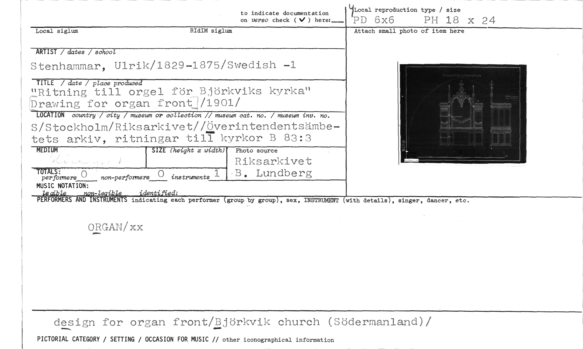 //// to indicate documentation on verso check ( V ) here: //// IlLocal reproduction type size //// PD 6x6 PH 18 x 24 //// Local siglum RIdIM siglum //// ARTIST / dates / school //// Stenhammar, Ulrik/1829-1875/Swedish -1 //// TITLE / date / place produced //// "Ritning till orgel för Björkviks kyrka" r- //// l)rawin(7 for organ fronf1/1901/ //// LOCATION country / city / museum or collection // museum cat. no. / museum inc. no. //// S/Stockholm/Riksarkivet//överintendentsämbetets arkiv, ritningar till kyrkor B 83:3 //// MEDIUM //// ORGAN/xx //// SIZE (hetght x width) //// Photo source //// Riksarkivet //// B. Lundberg //// Attach small photo of item here //// TUTUM //// per forners non-perfOrmers instruments //// MUSIC NOTATION: //// lecible non-leaible idenkified: //// PERFORMERS AND INSTRUMENTS indicating each performer (group by group), sex, INSTRUMENT (with details), singer, dancer, etc. //// design for organ front/Björkvik church (Södermanland)/ //// PICTORIAL CATEGORY / SETTING / OCCASION FOR MUSIC // other iconographical information ////