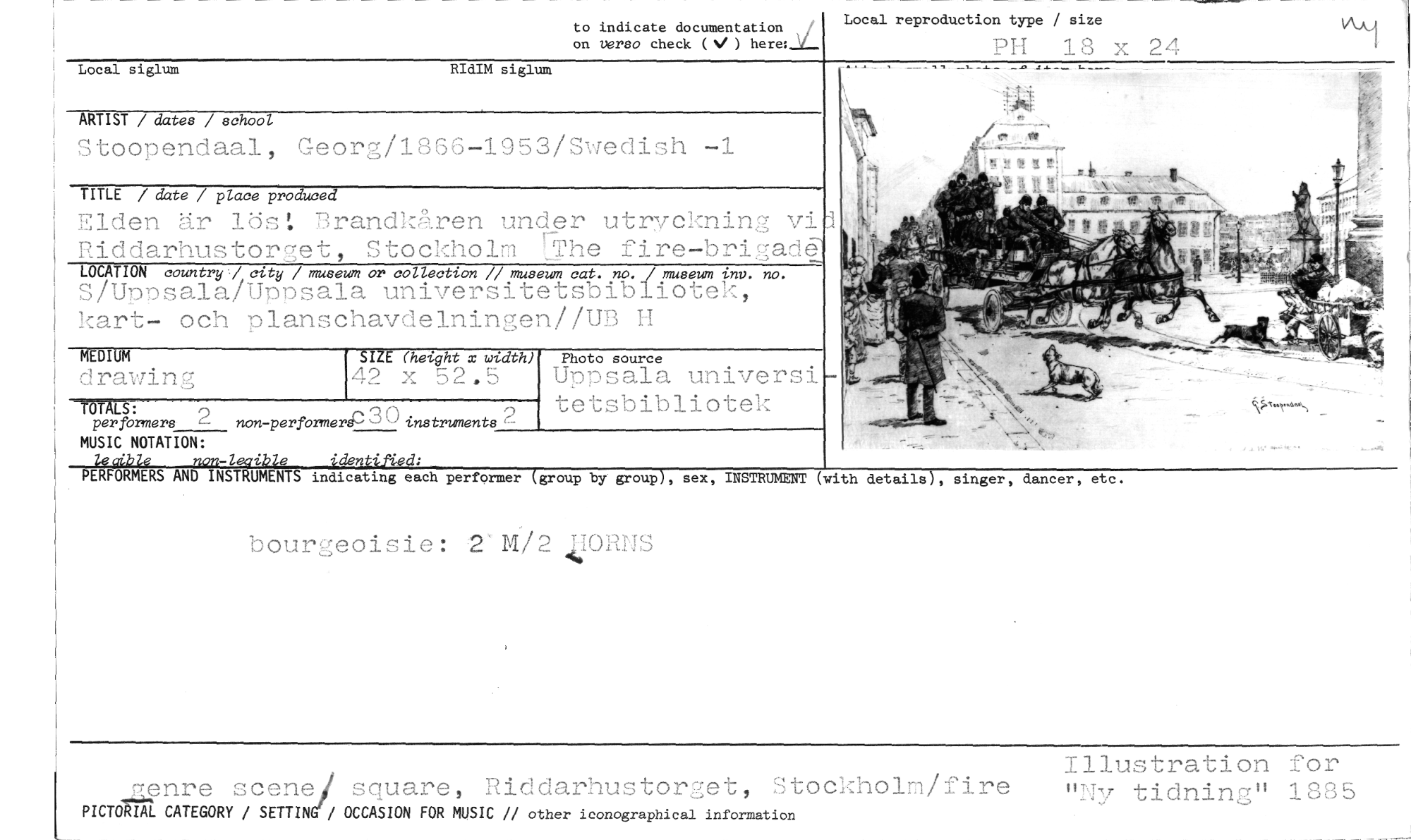 //// Local reproduction type / size //// PH 18 x 24 //// to indicate documentation //// on vers° check (N., ) here: //// Local siglum RIdIM siglum //// ARTIST / dates / school //// Stoopendaal, Georg/1866-1953/Swedish -1 //// TITLE / date / place produced //// Elden är lös: 73randkren under utryckning vi Riddarhustorget, Stockholm rThe fire-briade- //// LOCATION country / city / museum or collection // museum cat. no./ museum inv. no. //// S/Uonsala/Unnsala universitetsbibliotek, //// kart- och planschavdelnincYen//UB H //// MEDIUM SIZE (height x width) Photo source //// drawing 42 x 52.5 Uppsala universi tetsbibliotek //// -WALS: perfbrmers 2 non-perfOrmerg=30 instruments 2 //// bourgeoisie: 2 M/2 ZORNS //// .119nre scene/ square, Riddarhustorget, Stockholm/fire Illustration for "Ny tidning" 1885 //// PICTORIAL CATEGORY / SETTIN / OCCASION FOR MUSIC // other iconographical information //// MUSIC NOTATION: //// MURS AND IhtgATS indicating icating each performer (group by group), sex, INSTRUMENT (with details), singer, dancer, etc. ////