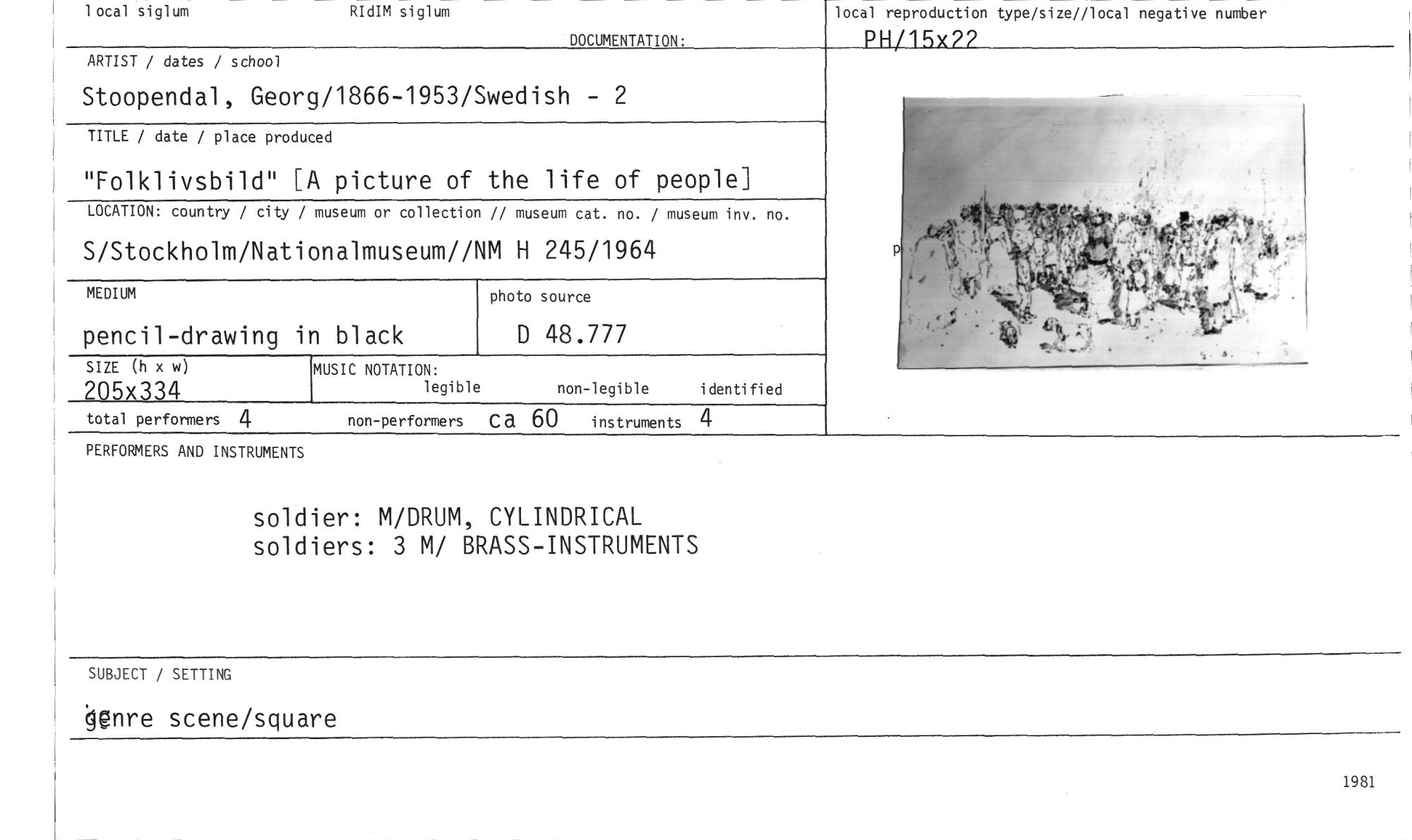 //// 1 ocal siglum RIdIM siglum local reproduction type/size//local negative number //// PH/15)02 //// ji , //// DOCUMENTATION: //// ARTIST / dates / school //// Stoopendal, Georg/1866-1953/Swedish - 2 //// TITLE / date / place produced //// "Folklivsbild" [A picture of the life of people] //// LOCATION: country / city / museum or collection // museum cat. no. / museum inv. no. //// S/Stockholm/Nationalmuseum//NM H 245/1964 //// photo source //// pencil-drawing in black //// SIZE (h x w) //// 205x334 //// MEDIUM //// D 48.777 //// MUSIC NOTATION: //// legible non-legible identified //// total performers 4 non-performers Ca 60 instruments 4 //// PERFORMERS AND INSTRUMENTS //// soldier: M/DRUM, CYLINDRICAL soldiers: 3 M/ BRASS-INSTRUMENTS //// SUBJECT / SETTING //// genre scene/square //// 1981 ////