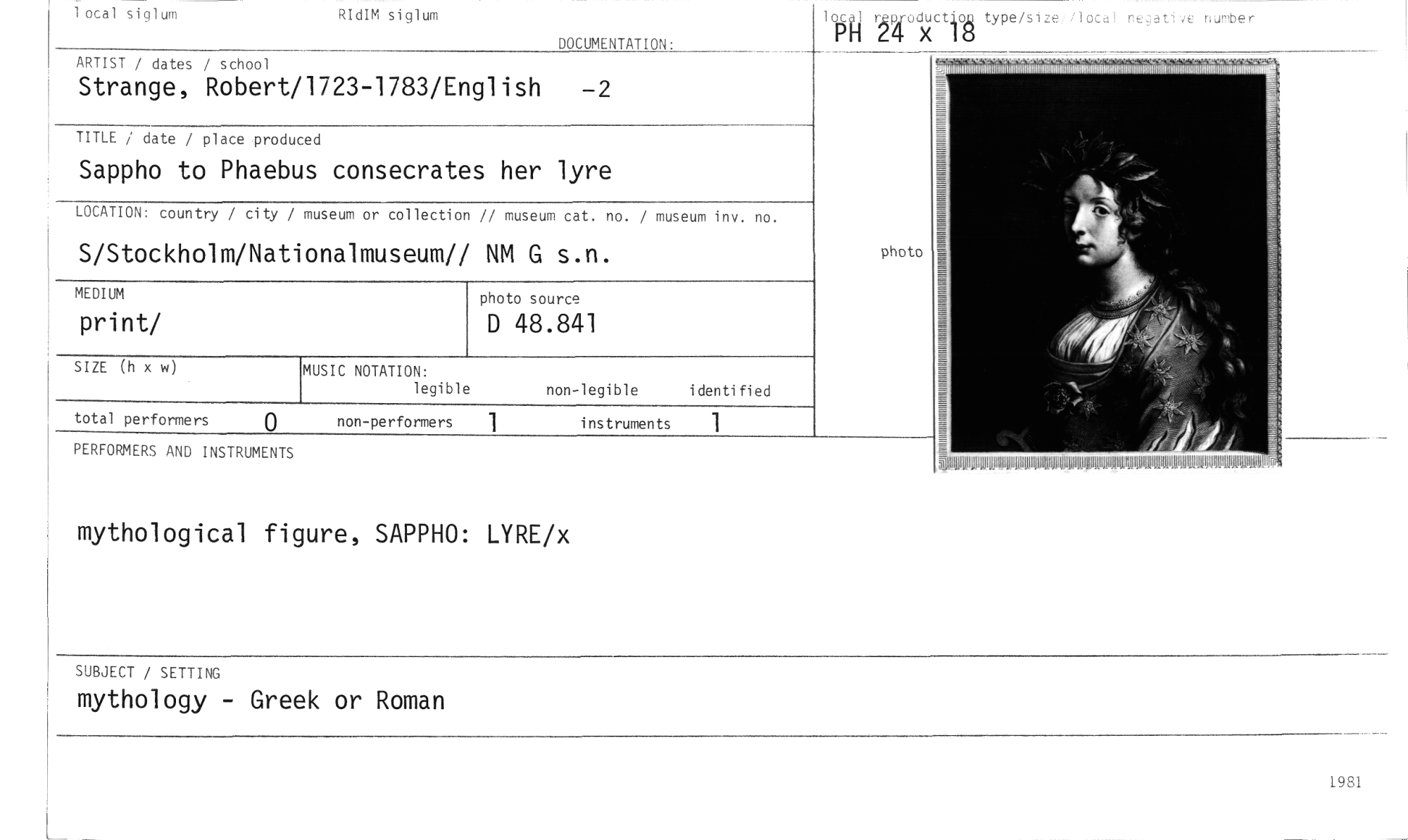 //// mythological figure, SAPPHO: LYRE/x //// local siglum RIdIM siglum //// DOCUMENTATION: //// ARTIST / dates / school //// Strange, Robert/1723-1783/English -2 //// fisk tfod;J(ctio type/size.: }ou! negative nutuber //// TITLE / date / place produced //// Sappho to Phaebus consecrates her lyre //// LOCATION: country / city / museum or collection // museum cat. no. / museum inv. no. //// S/Stockholm/Nationalmuseum// NM G s.n. //// photo //// MUSIC NOTATION: //// legible //// photo source //// D 48.841 //// non-legible identified //// MEDIUM //// print/ //// total performers //// non-performers //// instruments //// PERFORMERS AND INSTRUMENTS //// 91UMMUMM //// UfflelleafflUNIUMUNUM //// SUBJECT / SETTING //// mythology - Greek or Roman //// 1981 ////