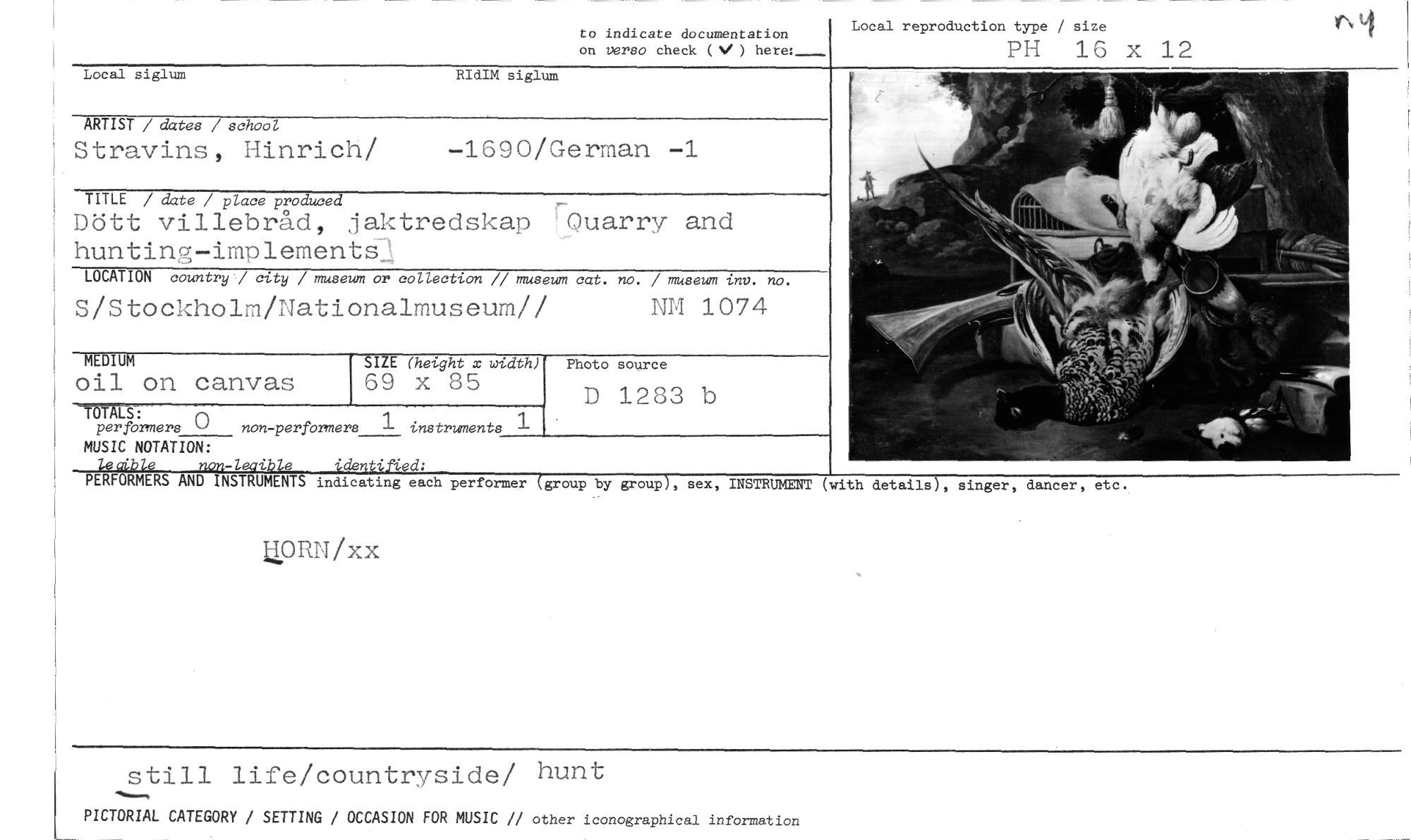 //// to indicate documentation //// on versa check (y' ) here:_ //// Local reproduction type / size //// PH 16 x 12 //// Local siglum RIdIM siglum //// ARTIST / dates / school //// Stravins, Hinrich/ -1690/German -1 //// TITLE / date / place produced //// Dött villebråd, jaktredskap rQuarry and hunting-implementS2 //// LOCATION country./ city / museum or collection // museum cat. no. / museum inv. no. //// S/Stockholm/Nationalmuseum// NM 1074 //// MEDIUM //// On on canvas //// Photo source //// SIZE (height x width) //// 69 x 85 //// D 1283 b //// TUALs: //// per formers 0 //// non-perförmers 1 instruments //// MUSIC NOTATION: //// aible non-leaible identifled: //// PERFORMERS AND INSTRUMENTS indicating each performer (group by group), sex, INSTRUMENT (with details), singer, dancer, etc. //// UORN/xx //// still life/countryside/ hunt //// PICTORIAL CATEGORY / SETTING / OCCASION FOR MUSIC // other iconographical information ////