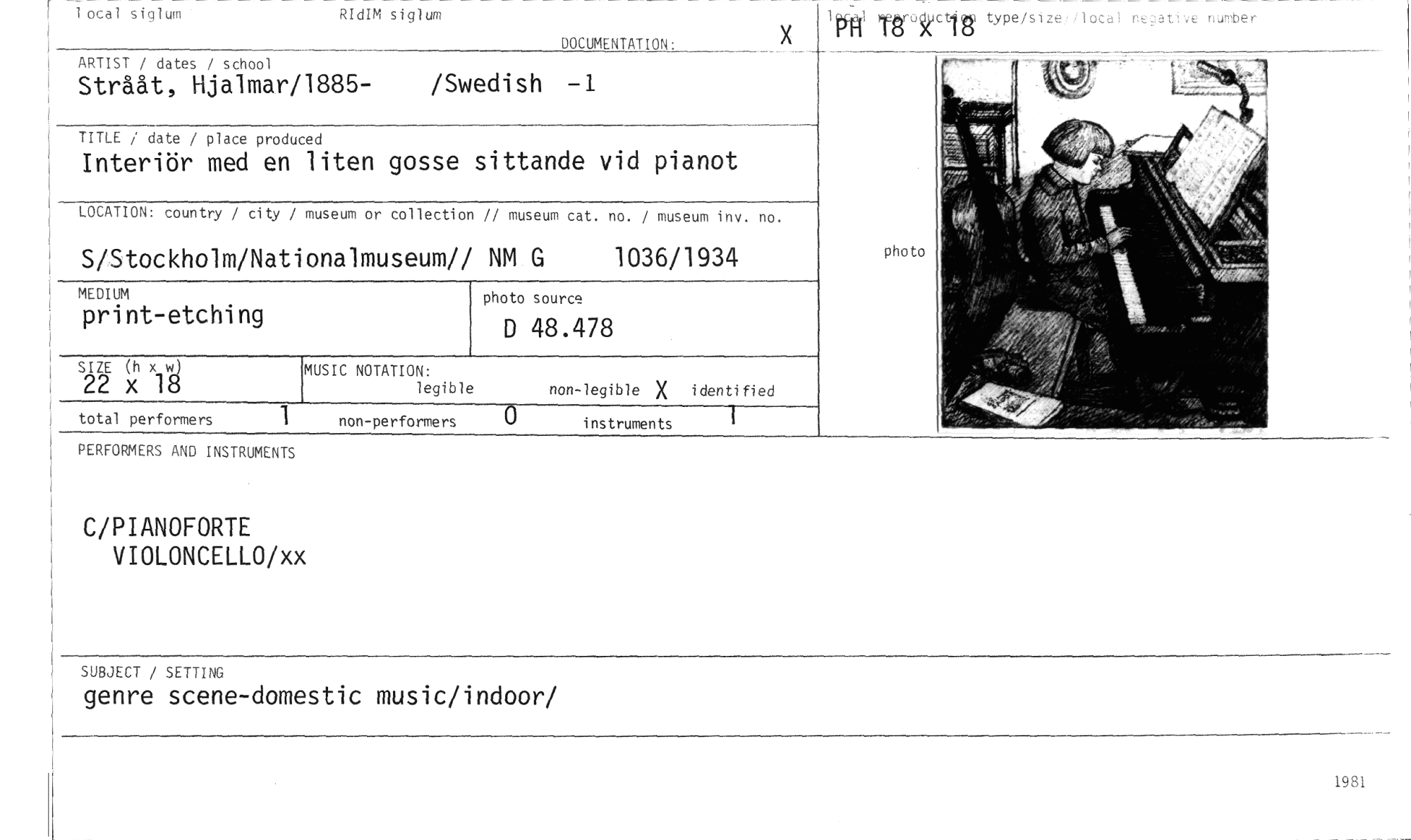 //// lotal siglum RIdIM siglum //// 1f411 Tt° type/size local negative number //// X //// DOCUMENTATION: //// ARTIST / dates / school //// Strååt, Hjalmar/1885- //// /Swedish -1 //// TITLE / date / place produced //// Interiör med en liten gosse sittande vid pianot //// museum or collection // museum cat. no. / museum inv. no. //// LOCATION: country / city / //// onalmuseum// NM G 1036/1934 //// S/Stockholm/Nat //// MEDIUM //// print-etching //// photo source //// D 48.478 //// S22 (xh vg //// MUSIC NOTATION: //// legible non-legible X identified //// non-performers //// 0 //// instruments //// total performers 1 //// PERFORMERS AND INSTRUMENTS //// C/PIANOFORTE VIOLONCELLO/xx //// SUBJECT / SETTING //// genre scene-domestic music/indoor/ //// 1951 ////