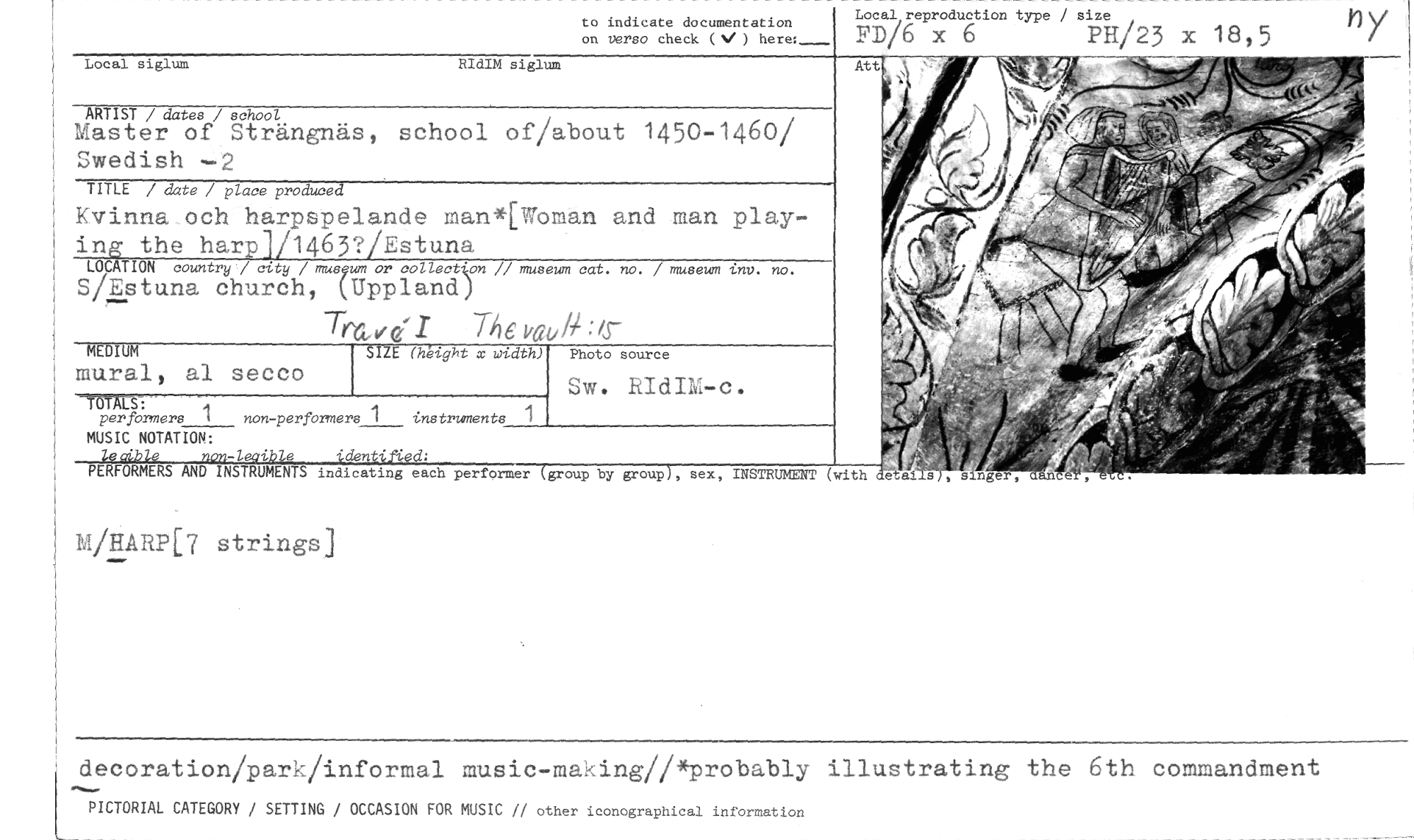 //// -1 i e *den .ed: //// PE FO ERS AND NSTRUMEN S indicating each performer group by group , sex, INSTRUMENT (with //// to indicate documentation //// on versa check (V ) here: _--- //// Local siglum RIdIM siglum //// ARTIST /01~ / school //// Master of Strängnäs, school of/about 1450-1460/ Swedish —2 //// TITLE /dote/placeprodum //// Kvinna_och harpspelande man*[Tidman and man play- //// ing the harp]/1463?/Estuna //// LOC'TION country / city / musgum or collection // museum cat. no. / museum ina,. no. //// S/Estuna church, (Uppland) //// Local reproduction type / size //// FD/6 x 6 PH/23 x 18,5 //// MEDIUM //// mural, al secco //// Tre„id I The ko,ll //// SIZE (Weight x width) Photo source //// Sw. RIdIM -c. //// TOTALS: 1 perfbrmers non-performers 1 instruments 1 //// MUSIC NOTATION: //// Att //// M/HARP[7 strings] //// decoration/park/informal music-making//*probably illustrating the 6th commandment //// PICTORIAL CATEGORY / SETTING / OCCASION FOR MUSIC // other iconographical information ////