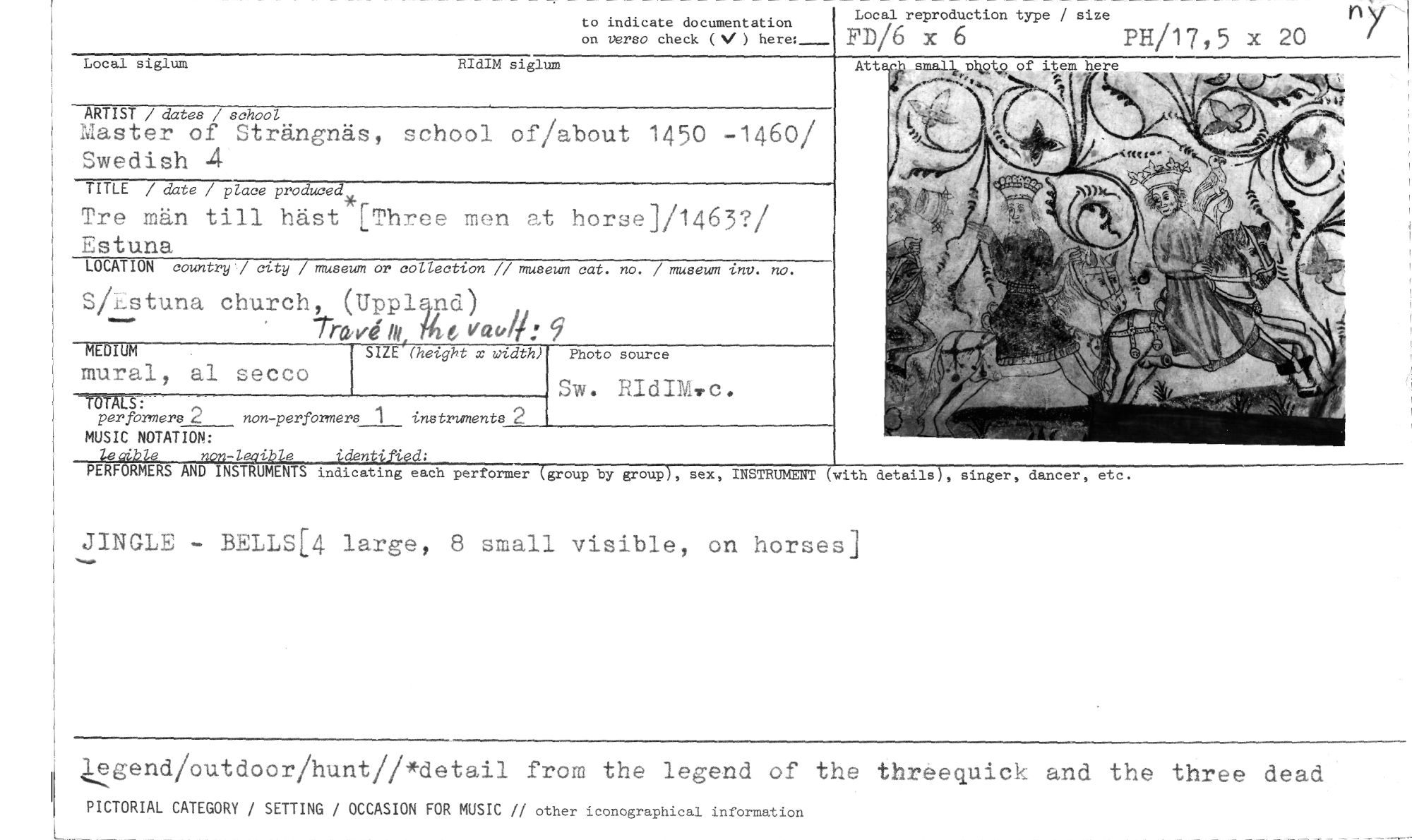 //// Local reproduction type / size //// FD/6 x 6 PH/17,5 x 20 //// to indicate documentation //// on vereo check (V ) here:___ //// Local siglum RIdIM siglum //// ARTIST / datee / school //// Master of Strängnäs, school of/about 1450 -1460/ Swedish 4 //// TITLE / date / place produced* //// Tre män till häst [Three men at horse]/1463?/ Estuna //// LOCATION country '/ city /museum or collection // museum cat. no. / museum inv. no. //// S/Lstuna church, (Uppl nd) //// 7-ravi /14 va&q: 9 //// MEDIUM SIZE (height x cidth) Photo source //// Att //// mural al secco //// Sw. RIdIM7c. //// IS: //// per formers 2 non-perfbrmers 1 instrwnenta 2 //// MUSIC NOTATION: //// lesible non-lalible identiAed: //// PERFORMERS AND INSTRUMENTS indicating each performer tgroup by groupj, sex, INSTRUMENT (with details4, singer, dancer, etc. //// JINGLE - BELL* large, 8 small visible, on horses] //// kgend/outdoor/hunt//*detail from the legend of the threequick and the three dead //// PICTORIAL CATEGORY / SETTING / OCCASION FOR MUSIC // other iconographical information ////