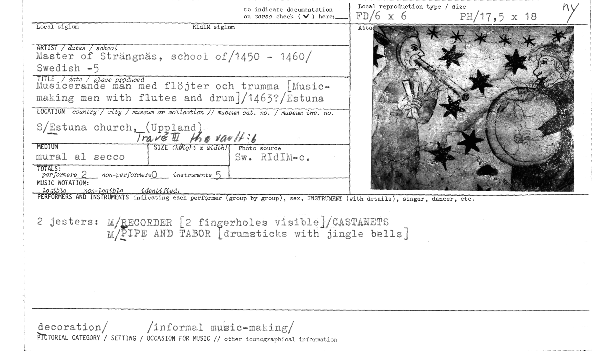 //// Local reproduction type / size //// FD/6 x 6 PH/17 5 x 18 //// to indicate documentation //// on versa check (V ) here:— //// Local siglum RIdIM siglum //// ARTIST / dates / school //// Master of Strängnäs, school of/1450 - 1460/ Swedish -5 //// TITLE / date / place produced //// Musicerande män med flöjter och trumma [Music-making men with flutes and drum]/1463?/Estuna //// LOCATION country / city / museum or collection // museum cat. no. / museum inv. no. //// S/Estuna church, (Uriland' //// Tra, Ms 0«/PI :6 //// MEDIUM //// mural al secco //// I SIZE (häright x width) Photo source //// =ALS: //// perfbamers 2 non-performersp___ instruments 5 //// MUSIC NOTATION: //// /e 41:14e non-leaible identified: //// PERFORMERS AND INSTRUMENTS //// indicating each pertormer group by group , sex, INSTRUMENT (with details), singer, dancer, etc. //// 2 jesters: WilECORDER [2 fingerholes visible]/CASTANETS M/PIPE AND TABOR Ldrumsticks with jingle Bells] //// decoration/ /informal music-marring/ //// PITTORIAL CATEGORY / SETTING / OCCASION FOR MUSIC // other iconographical information ////