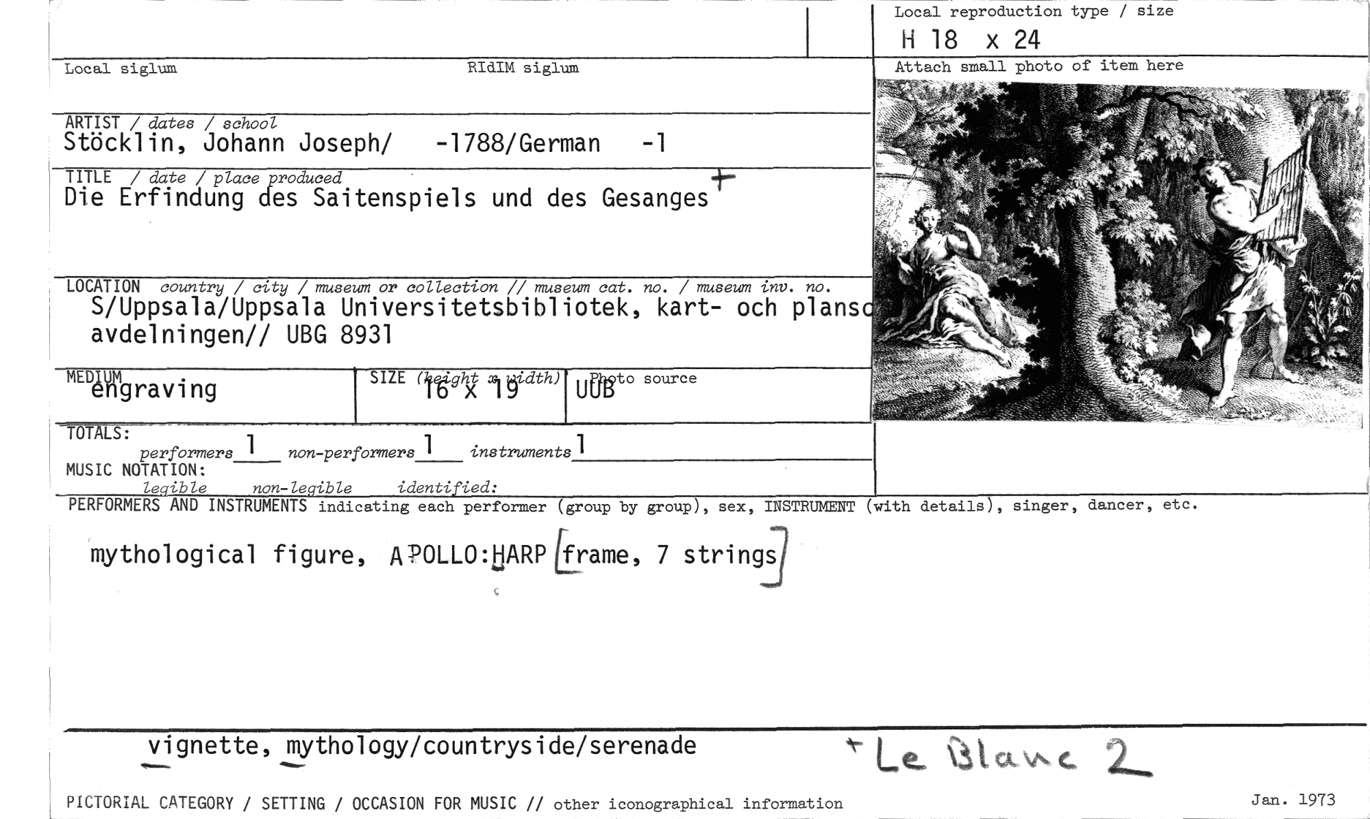 //// mythological figure, APOLLO:dARP Eframe, 7 stri //// vignette, mythology/countryside/serenade e \..t I ck, C //// PICTORIAL CATEGORY / SETTING / OCCASION FOR MUSIC // other iconographical information Jan. 1973 //// Local reproduction type / size //// i 18 x 24 //// Local siglum RIdIM siglum //// ARTIST / dates / school //// Stöcklin, Johann Joseph/ -1788/German //// TITLE / date / place roduced //// Die Erfindung des Saitenspiels und des Gesangest' //// p //// LOCATION country / city / museum or collection // museum cat. no. / museum inv. no. //// S/Uppsala/Uppsala Universitetsbibliotek, kart- och plans avdelningen// UBG 8931 //// SIZE (tet xl§Mth) //// u(45to source //// performers 1 non-performers 1 instruments 1 //// MUSIC NOTATION: //// Zegib/e non-legible identified: //// PERFORMERS AND INSTRUMENTS indicating each performer (group by group), sex, INSTRUMENT //// TOT LS: //// mmum //// eng raving //// (with details), singer, dancer, etc. ////