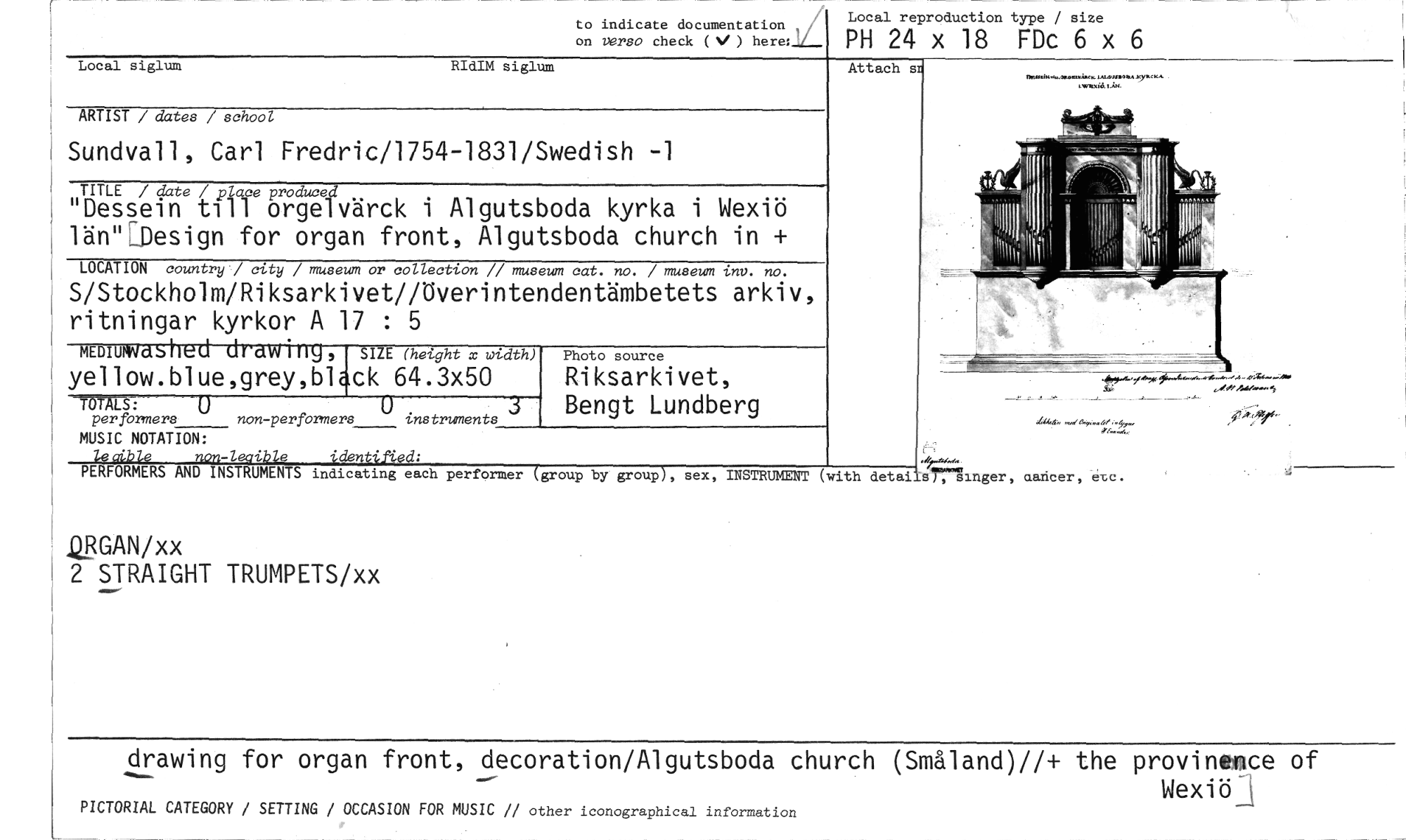 //// to indicate docunientation //// on versa check (V) here:21— PH 24 x 18 FDc 6 x 6 //// Local reproduction type / size //// MUSIC NOTATION: //// le aible non-leaible identified; //// PERFORMERS AND INSTRUMENTS indicating each performer (group by group), sex, INSTRUMENT (with detaiis);inger, cancer, etc. //// QBGAN/xx //// 2 STRAIGHT TRUMPETS/xx //// drawing for organ front, decoration/Algutsboda church (Småland)//+ the provineice of //// Wexiö- //// PICTORIAL CATEGORY / SETTING / OCCASION FOR MUSIC // other iconograpnical information //// Riksarkivet, Bengt Lundberg //// Photo source //// MEDIUNNdSheJ dretW ing 5 SIZE (hetght x width) //// yellow.blue,grey,bl&ck 64.3x50 //// LS: //// per formers non-performers instruments //// Attach s //// knmxidlim //// Local siglum RIdIM siglum //// ARTIST / dates / school //// Sundvall, Carl Fredric/1754-1831/Swedish -1 //// TITLE / date / place produced //// "Dessein t111 orgelvärck i Algutsboda kyrka i Wexiö //// län"lesign for organ front, Algutsboda church in + //// LOCATION country / city / museum or collection // museum cat. no. / museum inv. no. //// S/Stockholm/Riksarkivet//Uverintendentämbetets arkiv, ritningar kyrkor A 17 : 5 ////