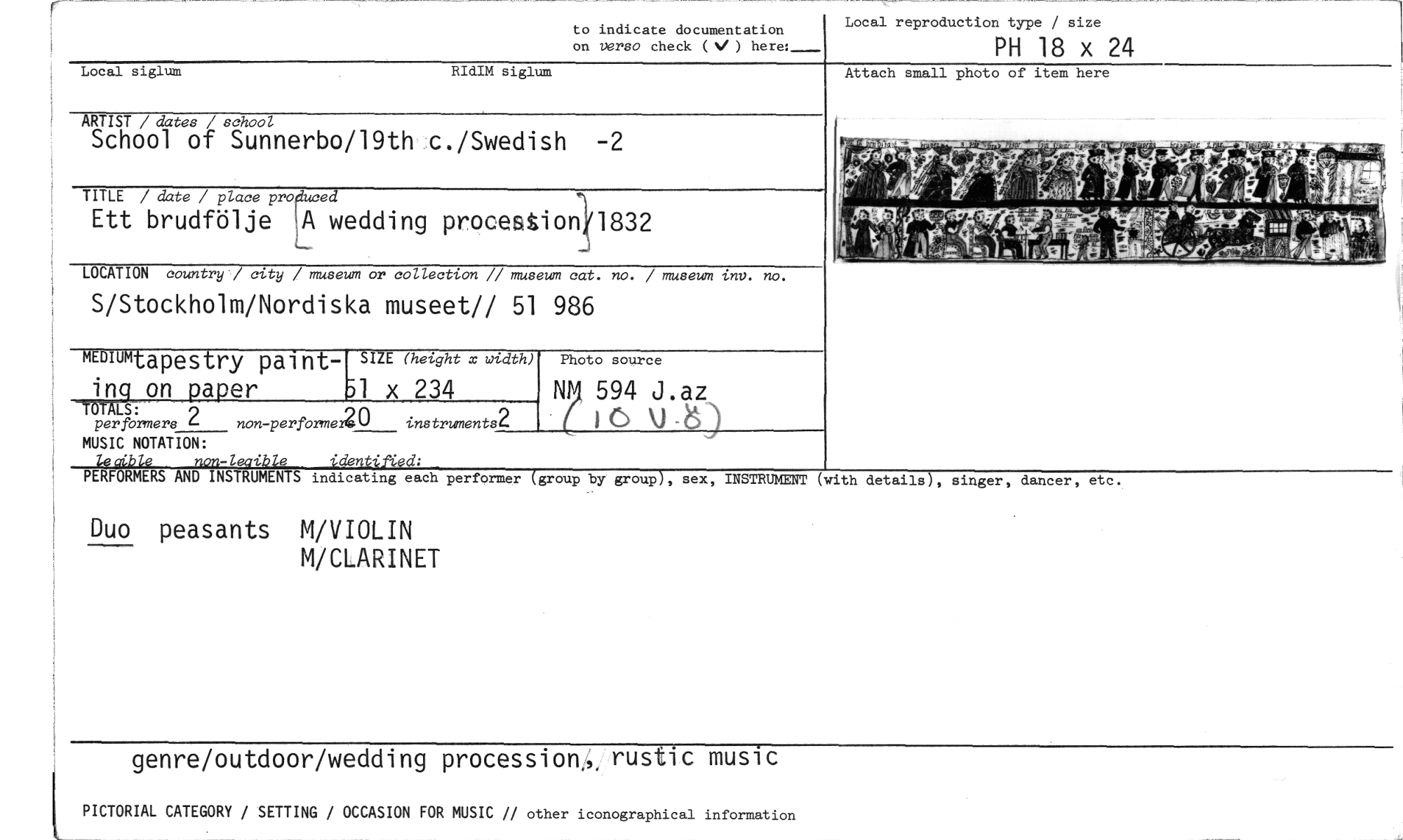 //// to indicate documentation //// on versa check (V) here:_ //// Local reproduction type / size //// PH 18 x 24 //// Attach small photo of item here //// Local siglum //// RIdIM siglum //// ARTIST / dates / school //// School of Sunnerbo/19th c./Swedish -2 //// TITLE / date / place pro ured //// Ett brudfölje A wedding procestion 1832 //// LOCATION country / city / museum or collection // museum cat. no. / museum inv. no. //// S/Stockholm/Nordiska museet// 51 986 //// capestry paint- //// SIZE (height x width) //// Photo source //// ing on paper //// TOTAS: //// per formers 2 non-performer20 instruments2 594 J.az )6 U //// 51 x 234 //// MUSIC NOTATION: //// led,b/e non-leaible //// PERFORMERS AND INSTRUMENTS indicating each performer (group by group), sex, INSTRUMENT //// Duo peasants M/VIOLIN //// M/CLARINET //// (with details), singer, dancer, etc. //// genre/outdoor/wedding procession, rustic music //// PICTORIAL CATEGORY / SETTING / OCCASION FOR MUSIC // other iconographical information ////