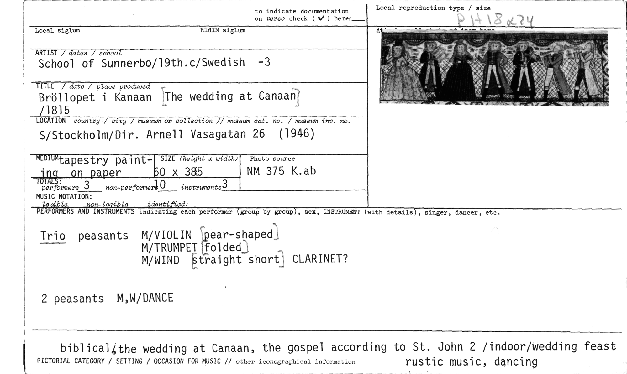 //// Local reproduction type / size //// to indicate documentation on versa check ( ) here: //// Local siglum //// ARTIST / dates / school //// School of Sunnerbo/19th.c/Swedish -3 //// TITLE / date / place produced //// Bröllopet i Kanaan The wedding at Canaan /1815 //// LOCATION country / city / museum or collection // museum cat. no. / museum inv. no. //// S/Stockholm/Dir. Arnell Vasagatan 26 (1946) //// mE"ta pestny paint- SIZE (height x width) //// paper 0 x 38E5 //// Photo source //// NM 375 K.ab //// per formers 3 non-performer39 instruments //// MUSIC NOTATION: //// Zealble non-leaible identilUd: //// PERFORMERS AND INSTRUMENTS //// indicating each performer (group by group), sex, INSTRUMENT (with details), singer, dancer, etc. //// Trio peasants M/VIOLIN Ipear-shaped //// M/TRUMPETIfolded-j //// M/WIND Ktraightshort7i CLARINET? //// 2 peasants M,W/DANCE //// biblicanthe wedding at Canaan, the gospel according to St. John 2 /indoor/wedding feast //// PICTORIAL CATEGORY / SETTING / OCCASION FOR MUSIC // other iconographical information rustic music, dancing ////