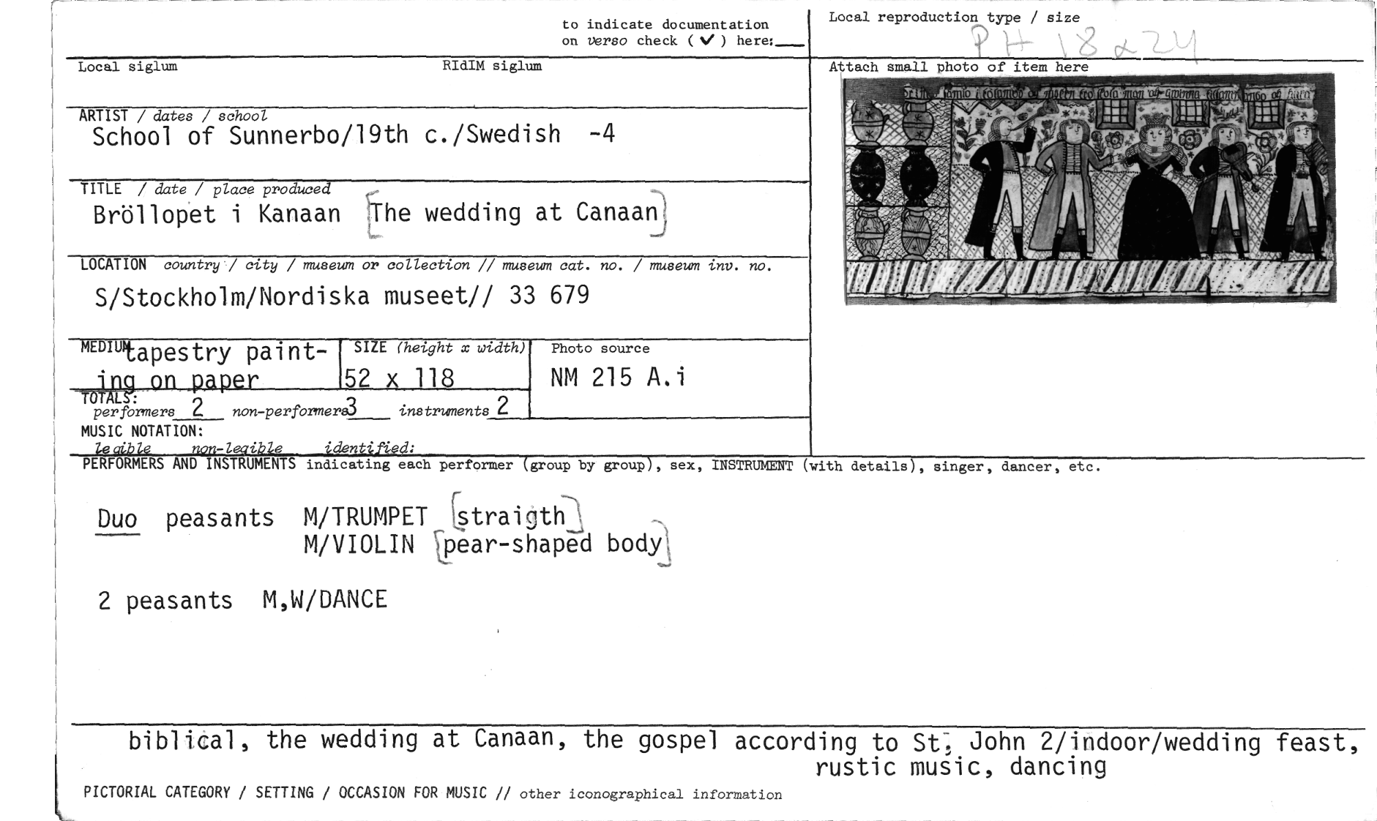 //// to indicate documentation //// on verso check (%1 ) here:- //// Local reproduction type / size //// Local siglum RIdIM siglum //// ARTIST / dates / school //// School of Sunnerbo/19th c./Swedish -4 //// TITLE / date / place produced //// Bröllopet i Kanaan ;The wedding at Canaan //// LOCATION country / city / museum or collection // museum cat. no. / museum inv. no. //// S/Stockholm/Nordiska museet// 33 679 Attach small photo of item here //// (d //// xklr '4Y 0 4 //// 1:› //// Ä4 1 li //// ... `WO Cent, ...e^M t //// 4k //// ritarafflarigillilff A Ar //// --- //// MDWIL- //// Idpestry pai nt- //// da21 2 49a9 //// per formers non-performer3 instruments //// MUSIC NOTATION: //// leaible non-leuible identified; //// PERFORMERS AND INSTRUMENTS indicating each //// SIZE (height x width) //// 52 x 118 //// er //// Photo source //// NM 215 A.i //// performer (group by group), sex, INSTRUMENT (with detailS), singer, dancer, etc. //// Duo peasants M/TRUMPET [straijth //// M/VIOLIN Spear-shaped body //// 2 peasants M,W/DANCE //// biblical, the wedding at Canaan, the gospel according to St-, John 2/indoor/wedding feast, //// rustic music, dancing //// PICTORIAL CATEGORY / SETTING / OCCASION FOR MUSIC // other iconographical information ////