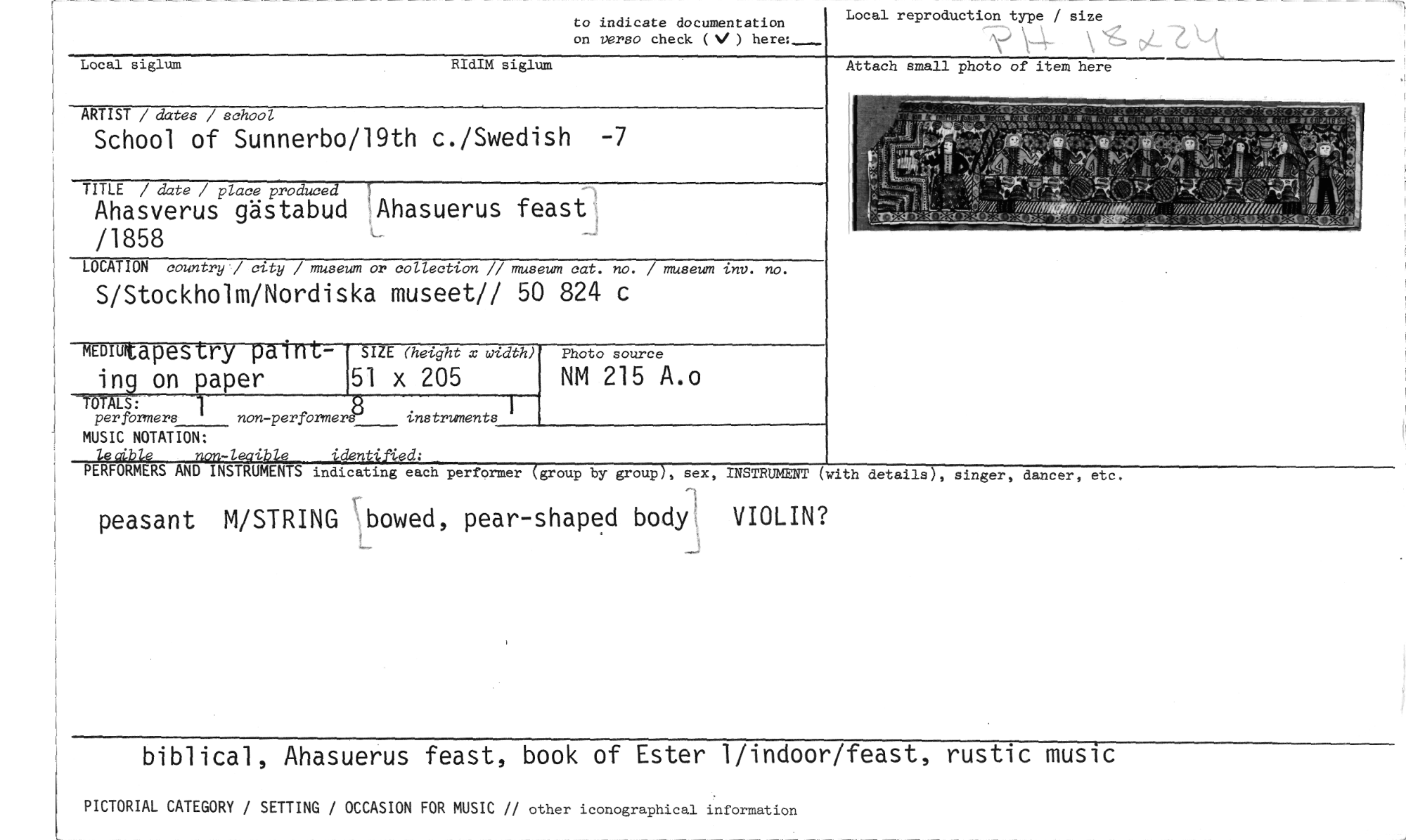 //// to indicate documentation on verso check ( ) //// Local reproduction type / size //// Local siglum RIdIM siglum //// ARTIST / dates / school //// School of Sunnerbo/19th c./Swedish -7 //// TITLE / date / place produced //// Ahasverus gästabud 'Ahasuerus feast, /1858 //// LOCATION country / city / museum or collection // museum cat. no. / museum Inv. no. //// S/Stockholm/Nordiska museet// 50 824 c //// Attach small photo of item here //// muurt apestry paint- //// ing on paper SIZE (height x width) //// 51 x 205 //// Photo source //// NM 215 A.o //// TOTALS: //// per formers non-performer instruments //// MUSIC NOTATION: //// le alble non-leaible identified; //// PERFORMERS AND INSTRUMENTS indicating each performer (group by group), //// sex, INSTRUMENT (with details), singer, dancer, etc. //// peasant M/STRING bowed, pear-shaped body VIOLIN? //// biblical, Ahasuerus feast, book of Ester 1/indoor/feast, rustic music //// PICTORIAL CATEGORY / SETTING / OCCASION FOR MUSIC // other iconographical information ////