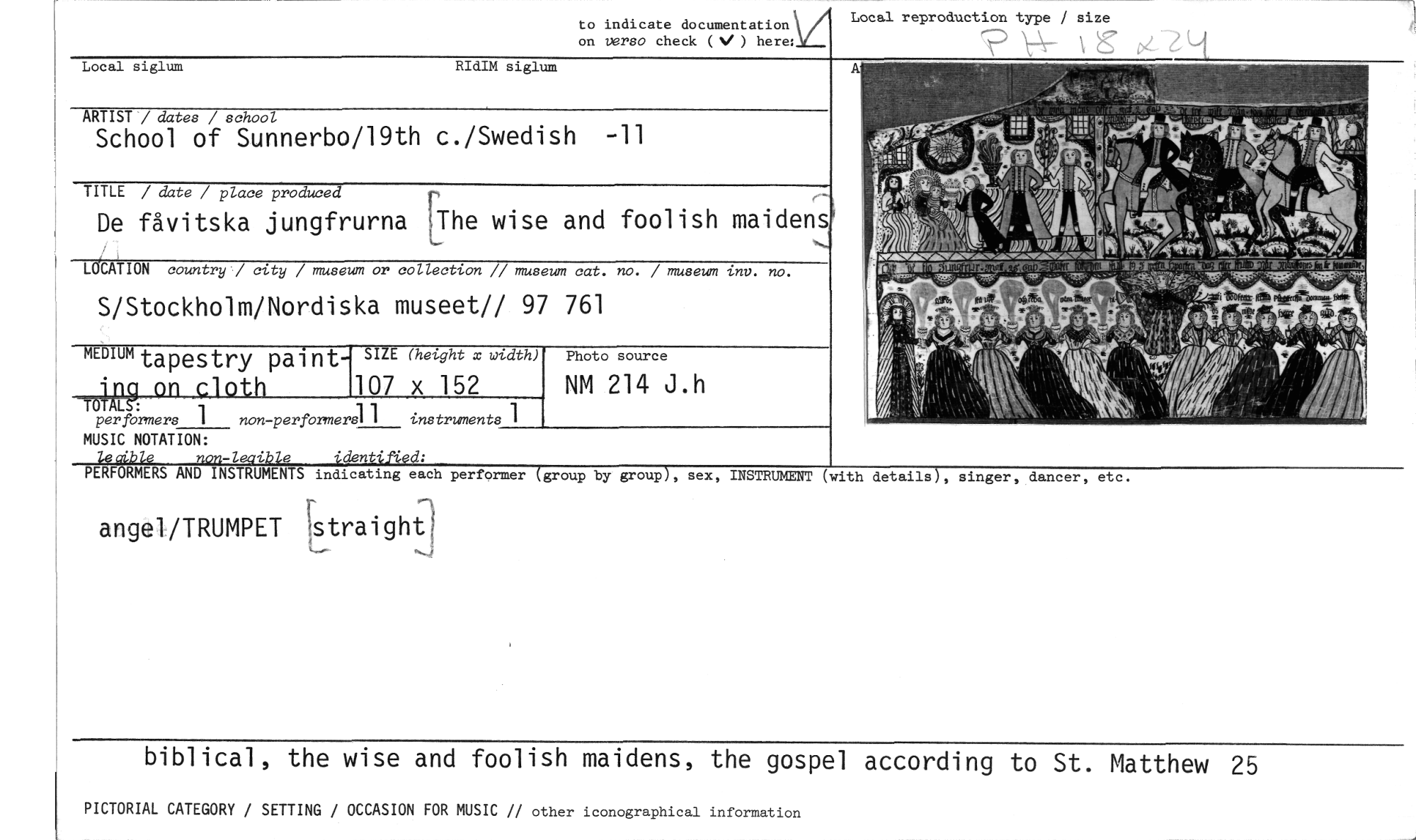 //// to indicate documentation //// on versa check (V ) here: //// Local reproduction type / size //// ARTIST/ dates / school //// School of Sunnerbo/19th c./Swedish -11 //// TITLE / date / place produced //// De fåvitska jungfrurna The wise and foolish maidens //// LOCATION country / city / museum or collection // museum cat. no. / museum inv. no. //// S/Stockholm/Nordiska museet// 97 761 //// MEDIUM tapestry p aint- //// SIZE (height x width) //// 107 x 152 //// NM 214 J.h //// T L : //// åpp on _cloth //// per formers 1 non-perfOrmers1 1 instruments 1 //// MUSIC NOTATION: //// lecale non-leaible identified: //// PERFORMERS AND INSTRUMENTS indicating each performer (group by group), //// sex, INSTRUMENT (with details), singer, dancer, etc. //// angel/TRUMPET straight //// biblical, the wise and foolish maidens, the gospel according to St. Matthew 25 //// PICTORIAL CATEGORY / SETTING / OCCASION FOR MUSIC // other iconographical information ////