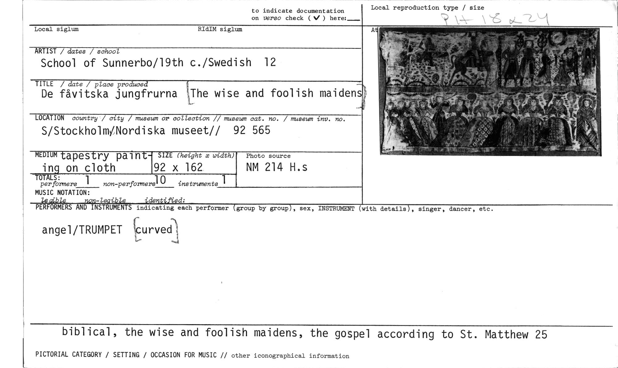 //// to indicate documentation on versa check ( ) here: //// Local reproduction type / size //// Local siglum RIdIM siglum //// ARTIST / dates / school //// School of Sunnerbo/19th c./Swedish 12 //// TITLE / date / place produced //// De fåvitska jungfrurna The wise and foolish maidens Y //// LOCATION country / city / museum or collection // museum cat. no. / museum inv. no. //// S/Stockholmaordiska museet// 92 565 //// MEDIUM tapestry paint- SIZE (hetght x lotdth) //// ing on cloth 92 x 162 //// TOMS: //// perfbrmers 1 non-perfOrmers1 ° instruments 1 //// Photo source //// NM 214 H.s //// MUSIC NOTATION: //// Zecnble non-leaible identified: //// PERFORMERS AND INSTRUMENTS indicating each performer //// -N //// angel/TRUMPET urved; //// (group by group), sex, INSTRUMENT (with details), singer, dancer, etc. //// biblical, the wise and foolish maidens, the gospel according to St. Matthew 25 //// PICTORIAL CATEGORY / SETTING / OCCASION FOR MUSIC // other iconographical information ////