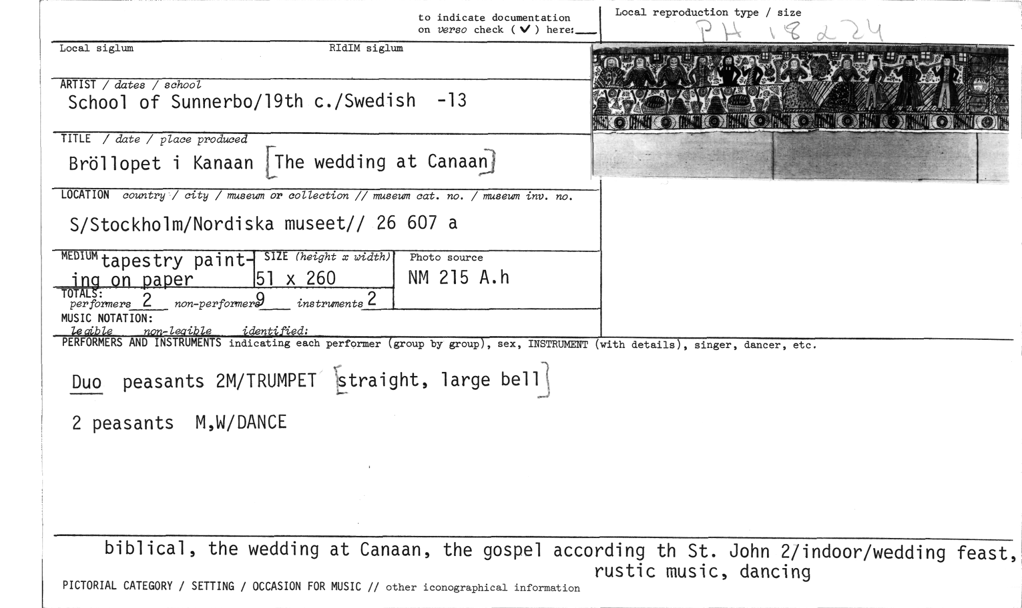 //// biblical, the wedding at Canaan, the gospel according th St. John 2/indoor/wedding feast,' //// rustic music, dancing //// PICTORIAL CATEGORY / SETTING / OCCASION FOR MUSIC // other iconographical information //// Local siglum //// by group //// group //// to indicate documentation //// on versa check (V ) here:_ //// Local reproduction type / size //// ARTIST / dates / school //// School of Sunnerbo/19th c./Swedish -13 //// TITLE / date / place produced //// Bröllopet i Kanaan //// LOCATION country / city / museum or collection // museum cat. no. / museum inv. no. //// S/Stockholm/Nordiska museet// 26 607 a //// MIDIUMtalpeStrY paint //// on paper //// TOTAL Snn //// per formers 2 non-performer9 instruments 2 //// MUSIC NOTATION: //// Ze aible non-leaible identified; //// RIdIM siglum //// PERFORMERS AND INSTRUMENTS indicating each performer //// , sex, INSTRUMENT (with details), singer, dancer, etc. //// Duo peasants 2M/TRUMPET straight, large bell 2 peasants M,W/DANCE //// SIZE (height x width) //// 51 x 260 //// Photo source //// NM 215 A.h ////