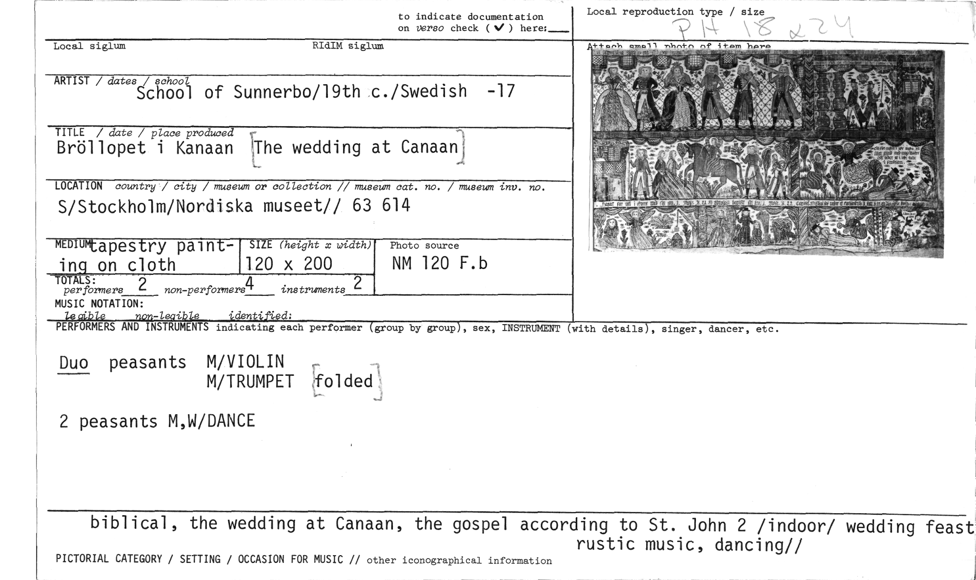 //// to indicate documentation //// on Verso check ( ) here:_ //// Local reproduction type / size //// ARTIST / dates / school //// School of Sunnerbo/19th c./Swedish -17 //// TITLE / date / place produced //// Bröllopet i Kanaan ',The wedding at Canaan //// LOCATION country / city / museum or collection // museum cat. no. / museum inv. no. //// S/Stockholm/Nordiska museet// 63 614 //// MEDIUMt apestry paint- //// SIZE (height x width) //// in cloth //// Photo source //// NM 120 F.b //// 120 x 200 //// 0 LS: //// per formers 9 non-performers 4 instruments //// MUSIC NOTATION: //// VacibLe non-leaibie identilUd: //// PERFORMERS AND INSTRUMENTS indicating each performer (group by group), sex, //// INSTRUMENT (with details), singer, dancer, etc. //// Duo peasants M/VIOLIN //// M/TRUMPET Toldedi //// 2 peasants M,W/DANCE //// PICTORIAL CATEGORY / SETTING / OCCASION FOR MUSIC // other iconographical information //// biblical, the wedding at Canaan, the gospel according to St. John 2 /indoor/ wedding feast //// rustic music, dancing// ////