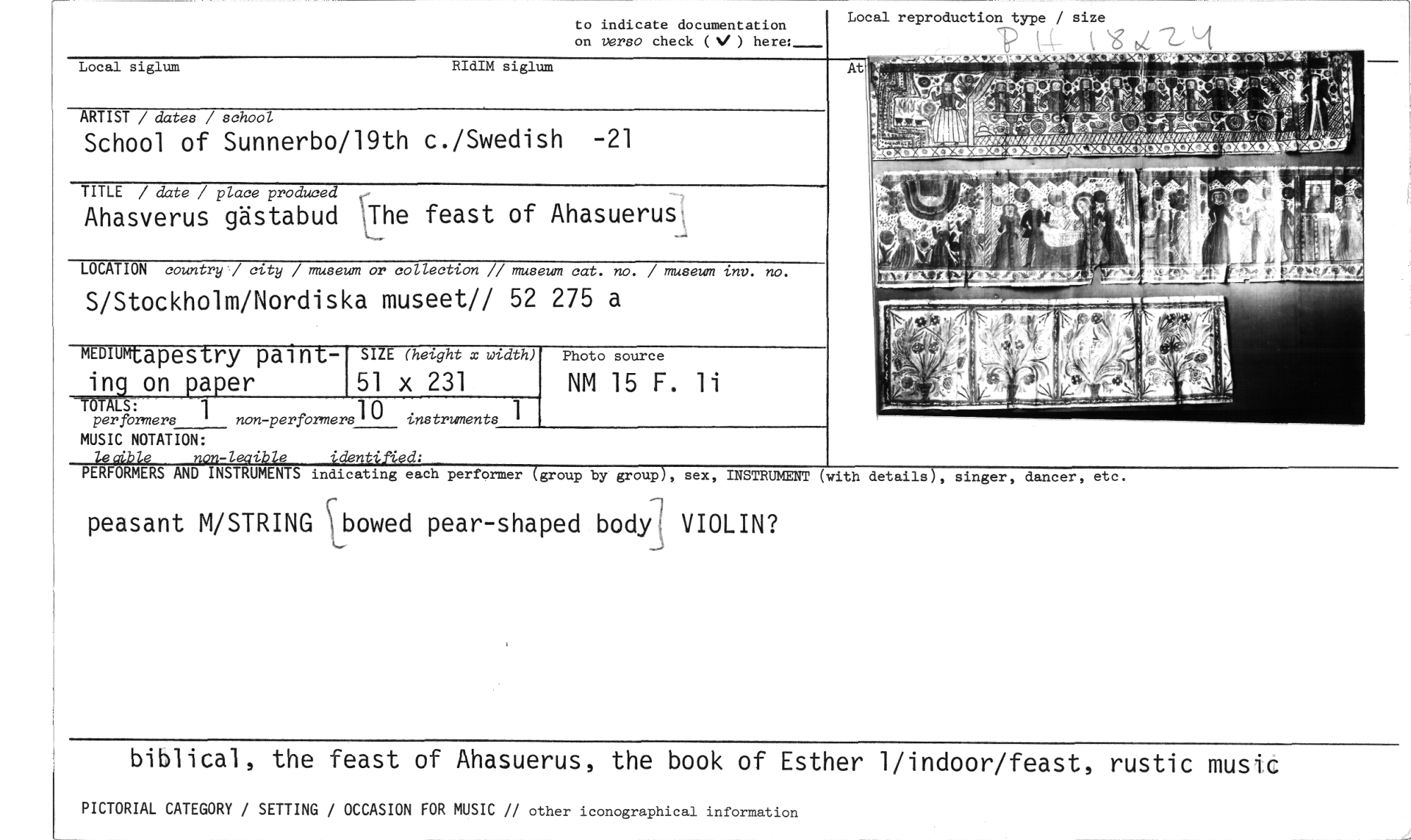//// to indicate documentation Local reproduction type / size //// on verso check ( ) here:_ ‘‘ig //// Local siglum RIdIM siglum //// ARTIST / dates / school //// School of Sunnerbo/19th c./Swedish -21 //// TITLE / date / place produced //// Ahasverus gästabud ;The feast of Ahasuerus; //// LOCATION country / city / museum or collection // museum cat. no. / museum inv. no. //// S/Stockholm/Nordiska museet// 52 275 a //// MEDIUMt apestry paint- SIZE (hetght x width) //// ing on paper 51 x 231 //// TOTALS: //// per formers 1 ' non-performersl° instruments 1 //// MUSIC NOTATION: //// -/ i e 'dent. " //// PERFORMERS AND INSTRUMENTS indicating each performer //// peasant M/STRING ibowed pear-shaped body VIOLIN? //// biblical, the feast of Ahasuerus, the book of Esther 1/indoor/feast, rustic music //// PICTORIAL CATEGORY / SETTING / OCCASION FOR MUSIC // other iconographical information //// Photo source //// NM 15 F. li //// At //// Fb //// , //// group by group , sex, INSTRUMENT (with , singer, dancer, etc. ////