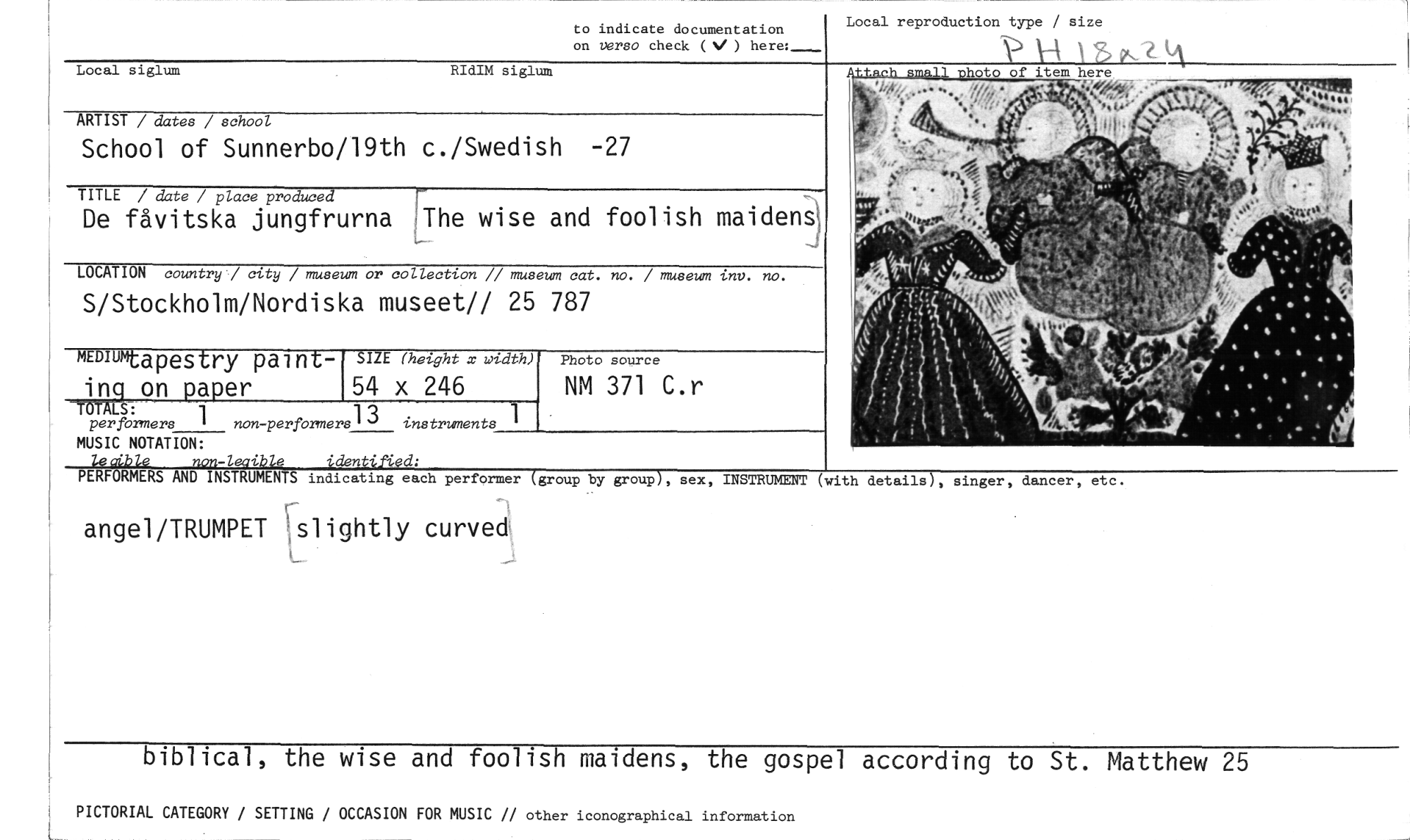 //// to indicate documentation //// on verso check ( ) here:_ //// Local reproduction type / size //// Local siglum RIdIM siglum //// ARTIST / dates / school //// School of Sunnerbo/19th c./Swedish -27 //// item here //// 4W' - //// TITLE / date / place produced //// De fåvitska jungfrurna ;The wise and foolish maidens //// LOCATION country / city / museum or collection // museum cat. no. / museum inv. no. //// S/Stockholm/Nordiska museet// 25 787 //// MEDIUN //// tapestry pairil: - SIZE (hetght x wtdth) Photo source //// ing on paper 54 x 246 NM 371 C.r //// TÖTALS: //// per formers i i non-perfOrmers13 instruments //// MUSIC NOTATION: //// non-/egib/e PERFORMERS AND INSTRUMENTS indicating each performer (group by group), sex, //// angel/TRUMPET slightly curved, //// INSTRUMENT (with details), singer, dancer, etc. //// biblical, the wise and foolish maidens, the gospel according to St. Matthew 25 //// PICTORIAL CATEGORY / SETTING / OCCASION FOR MUSIC // other iconographical information ////