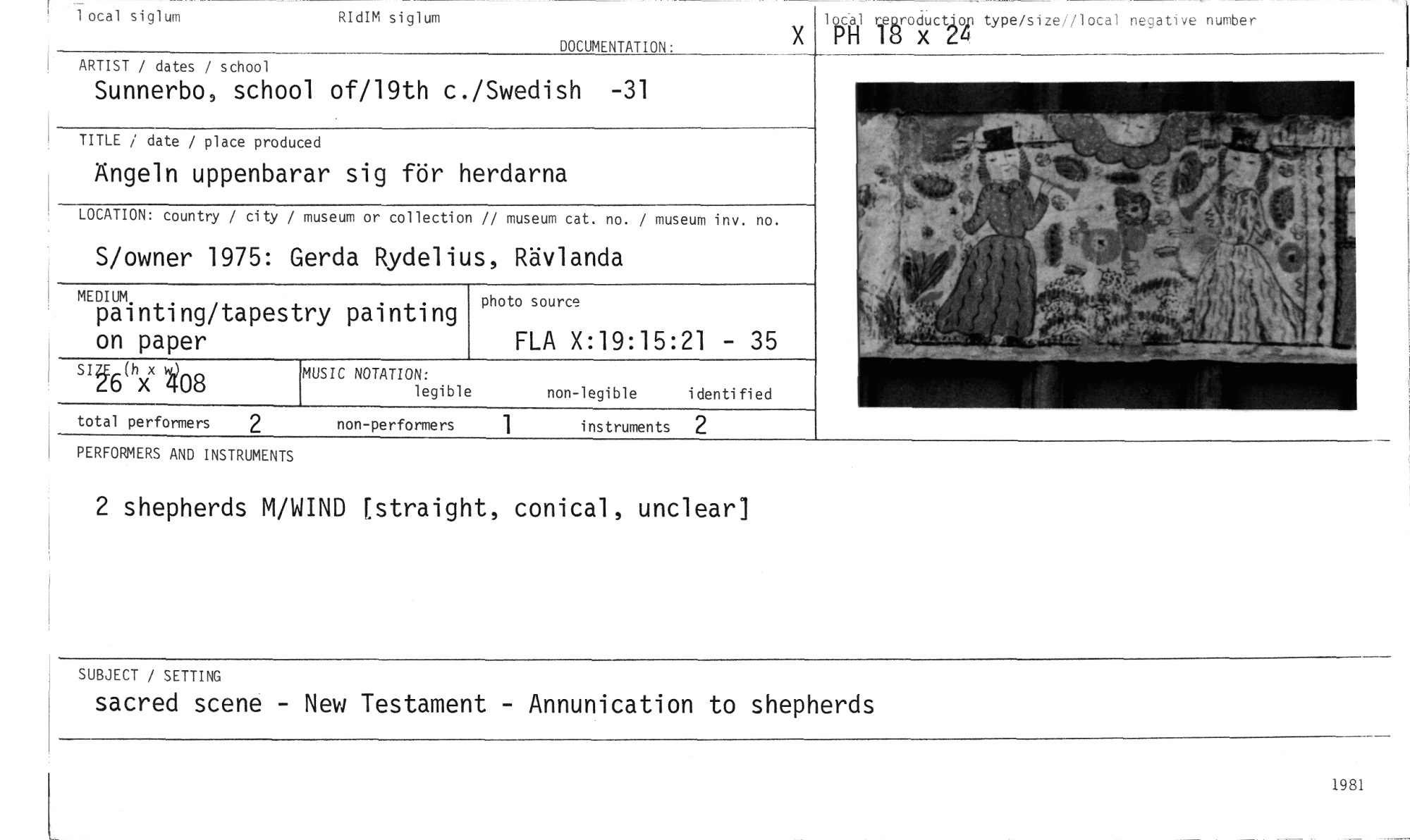 //// 1 ocal siglum RIdIM siglum //// DOCUMENTATION: //// kcal worodUct o type/size//local negative number //// PH 18 //// ARTIST / dates / school //// Sunnerbo, school of/19th c./Swedish -31 //// TITLE / date / place produced //// Ängeln uppenbarar sig för herdarna //// LOCATION: country / city / museum or collection // museum cat. no. / museum inv. no. //// S/owner 1975: Gerda Rydelius, Rävlanda //// MEDIUM //// painting/tapestry painting on paper //// MUSIC NOTATION: //// legible non-legible identified //// total performers 2 non-performers 1 instruments 2 //// si 6(,,x ,408 //// photo source //// FLA X:19:15:21 - 35 //// PERFORMERS AND INSTRUMENTS //// 2 shepherds M/WIND (straight, conical, unclear] //// SUBJECT / SETTING //// sacred scene - New Testament - Annunication to shepherds //// 1981 ////