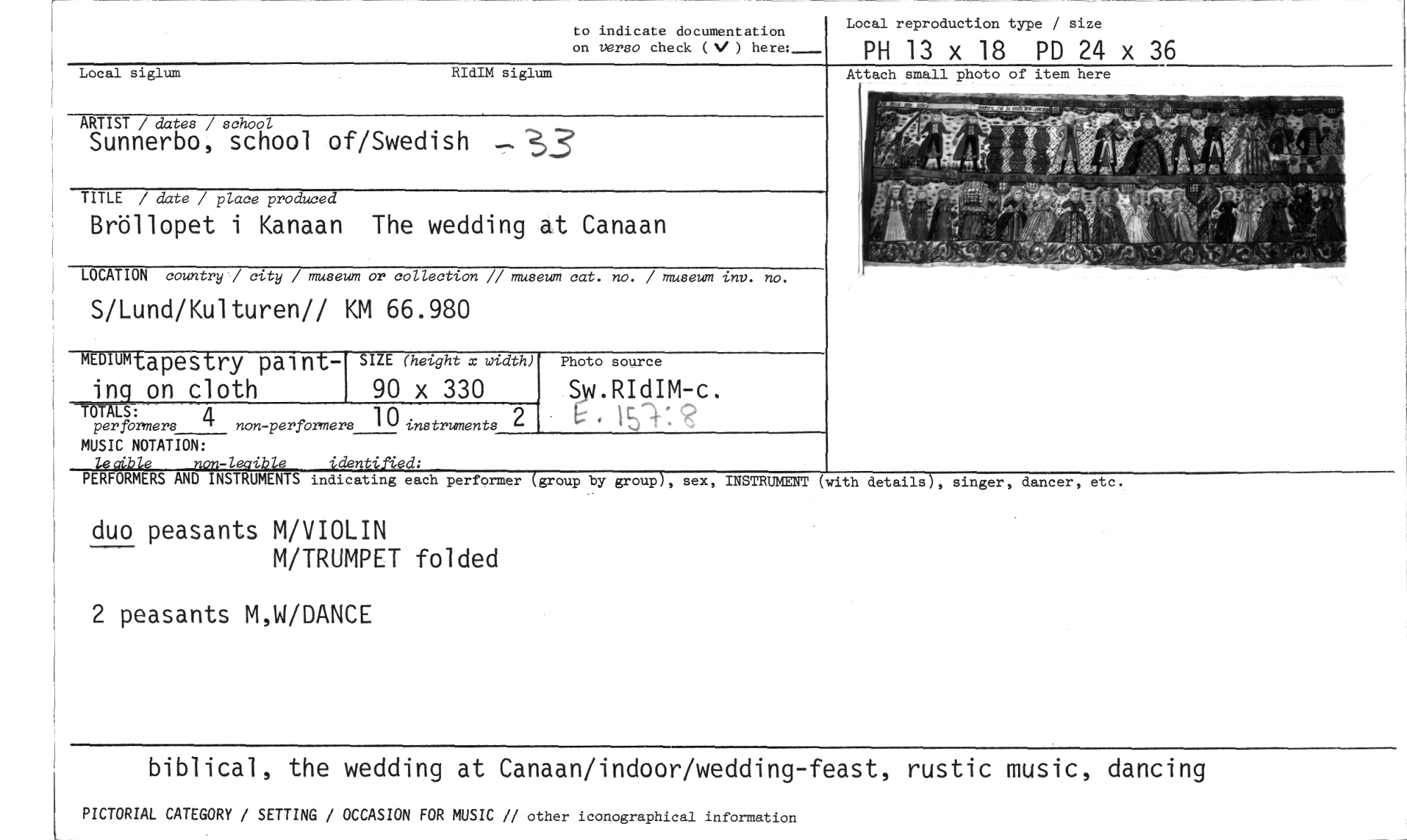 //// to indicate documentation Local reproduction type / size //// on verso check (V) here:- PH 13 x 18 PD 24 x 36 //// Local siglum RIdIM siglum //// ARTIST / dates / school //// Sunnerbo, school of/Swedish //// TITLE / date / place produced //// Bröllopet i Kanaan The wedding at Canaan //// LOCATION country / city / museum or collection // museum cat. no. / museum tnv. no. //// S/Lund/Kulturen// KM 66.980 //// Attach small photo of item here //// MEMM tapestry painting on cloth //// SIZE (height x width) //// 90 x 330 Photo source //// Sw.RIdIM- //// TOWLS: //// per formers 4 non-perfOrmers 1° instruments 2 //// MUSIC NOTATION: //// non-lecible identified; //// PERFORMERS AND INSTRUMENTS indicating each performer //// (group by group), sex, INSTRUMENT (with details), singer, dancer, etc. //// duo peasants M/VIOLIN //// M/TRUMPET folded //// 2 peasants M,W/DANCE //// biblical, the wedding at Canaan/indoor/wedding-feast, rustic music, dancing //// PICTORIAL CATEGORY / SETTING / OCCASION FOR MUSIC // other iconographical information ////