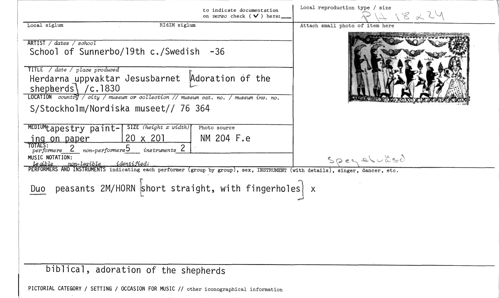 //// to indicate documentation on verso check (N/ ) here: //// Local reproduction type / size //// g Å -11 //// Local siglum RIdIM siglum //// small photo //// ARTIST / dates / school //// School of Sunnerbo/l9th c./Swedish -36 //// TITLE / date / place p oduced //// Herdarna uppvaktar Jesusbarnet ledoration öf the shepberds\ /c.1830 //// LOCATION countr / city / museum or collection // museum cat. no. / museum inv. no. //// S/Stockholm/Nordiska museet// 76 364 //// Photo source //// NM 204 F.e //// mmota pestry paint- SIZE (hetght x un.dth) 41gLAMDAper 20 x 201 //// T LS: //// per formers 2 non -performers5 instruments 2 //// MUSIC NOTATION: //// leaible non-lentible identified: //// PERFORMERS AND INSTRUMENTS indicating each performer (group by group), sex, //// INSTRUMENT (with details), singer, dancer, etc. //// Duo peasants 2M/HORN short straight, with fingerholes) x //// biblical, adoration of the shepherds //// PICTORIAL CATEGORY / SETTING / OCCASION FOR MUSIC // other iconographical information ////