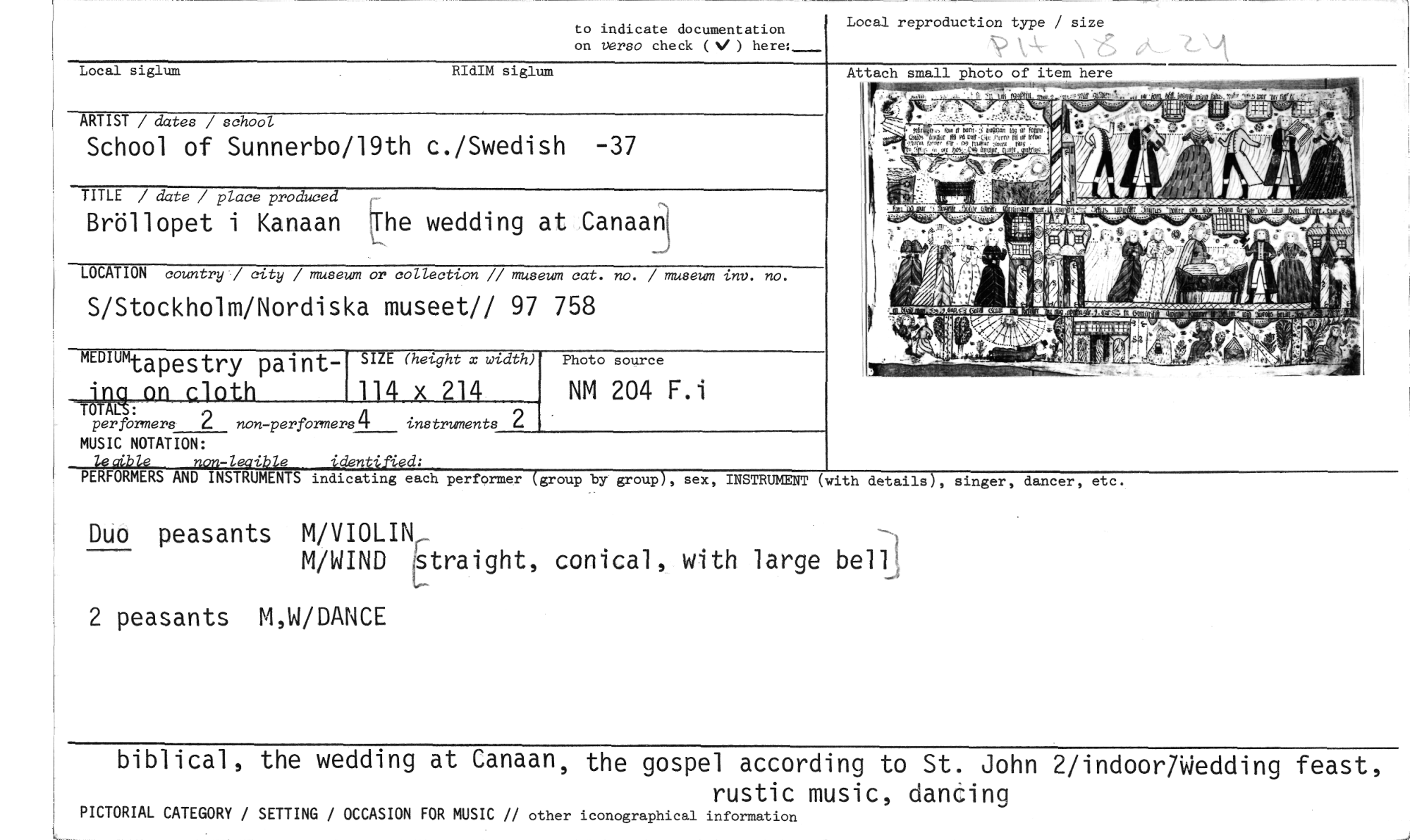 //// Alon cloth 114 x 214 NM 204 F.i //// perfbrmers 2 non -performers4 instruments 2 //// MUSIC NOTATION: //// lecible non-leaible identified; //// PERFORMERS AND INSTRUMENTS indicating each performer (group by group), sex, INSTRUMENT (with details), singer, dancer, etc. //// Duo peasants M/VIOLINr //// M/WIND istraight, conical, with large beW //// 2 peasants M,W/DANCE //// biblical, the wedding at Canaan, the gospel according to St. John 2/indoor7Wedding feast, //// rustic music, dancing //// PICTORIAL CATEGORY / SETTING / OCCASION FOR MUSIC // other iconographical information //// Photo source //// munuru. //// .Lapestry paint- SIZE (hetght x width) //// to indicate documentation //// on Versa check (N/ ) here:_ //// Local siglum RIdIM siglum //// ARTIST / dates / school //// School of Sunnerbo/19th c./Swedish -37 //// TITLE / date / place produced //// Bröllopet i Kanaan The wedding at Canaani //// LOCATION country / city / museum or collection // museum cat. no. / museum inv. no. //// S/Stockholm/Nordiska museet// 97 758 //// Local reproduction type / size //// Attach small photo of item here //// L ////