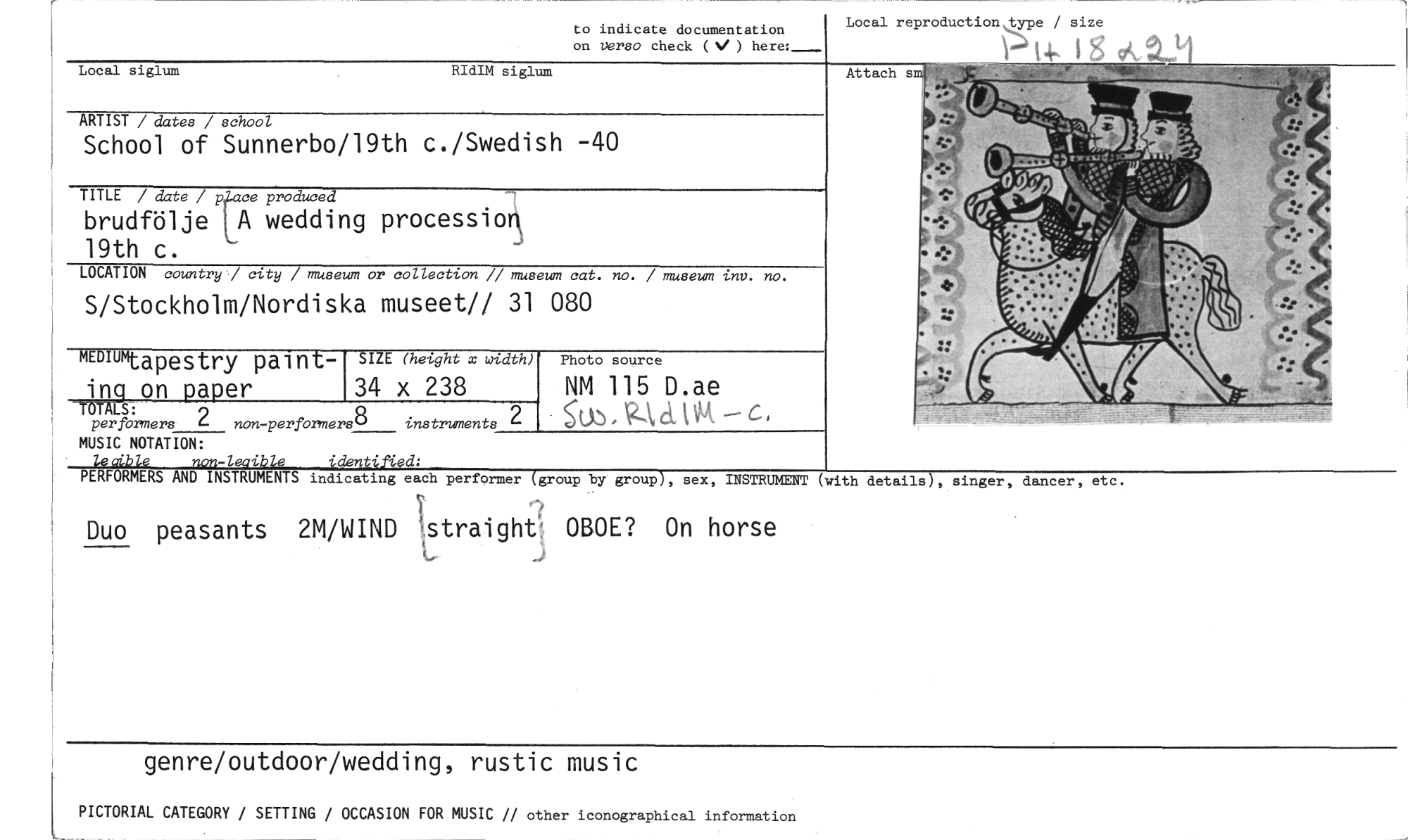 //// to indicate documentation //// on verso check (V ) here:_ //// Local siglum RIdIM siglum //// ARTIST / dates / school //// School of Sunnerbo/19th c./Swedish -40 //// C //// TITLE / date / p ce produced //// brudfölje A wedding processiork //// -.> //// 19th c. //// LOCATION country / city / museum or collection // museum cat. no. / museum inv. no. //// S/Stockholm/Nordiska museet// 31 080 //// MEDIUrta pes try paint- SIZE (height xw-tdth) //// ing on Dager 34 x 238 //// MALS: //// per formers 2 non-performers8 instruments 2 //// Local reproductio e / size //// 4-I q //// Attach //// b. //// • 4. #.5 //// • //// . • //// Photo source //// NM 115 D.ae 511),9-AdalM- //// MUSIC NOTATION: //// lecible non-leaible identified: //// PERFORMERS AND INSTRUMENTS indicating each performer A-group by groupY, sex, INSTRUMENT //// (with details), singer, dancer, etc. //// Duo peasants 2M/WIND straight OBOE? On horse //// genre/outdoor/wedding, rustic music //// PICTORIAL CATEGORY / SETTING / OCCASION FOR MUSIC // other iconographical information ////