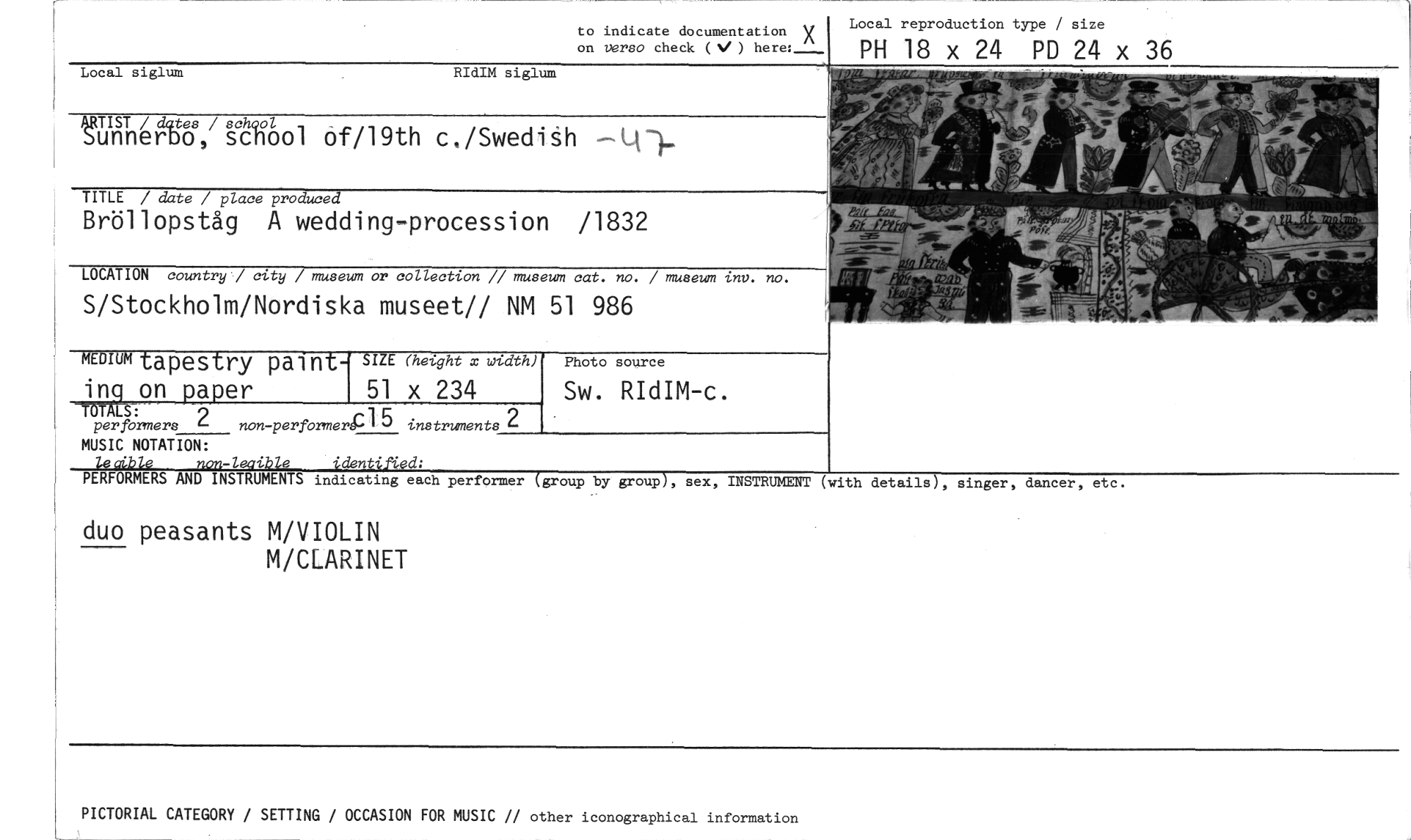 //// to indicate documentation on verso check (N/ ) here: //// Local reproduction type / size //// PH 18 x 24 PD 24 x 36 //// TInTnegt8',/gt146o1 of/19th c./SwediSh //// MEDIUM tapestry paint- //// Photo source //// SIZE (height x width) //// 51 x 234 //// Sw. RIdIM-c. //// ing on paper //// -rum: //// per formers 2 non-performerÄ 5 instruments 2 //// MUSIC NOTATION: //// lecible non-leaible identified: //// PERFORMERS AND INSTRUMENTS indicating each performer //// INSTRUMENT (with //// (group by group), sex, //// details), singer, dancer, etc. //// duo peasants M/VIOLIN //// M/CLARINET //// PICTORIAL CATEGORY / SETTING / OCCASION FOR MUSIC // other iconographical information //// TITLE / date / place produced //// Bröllopståg A wedding-procession /1832 //// LOCATION country '/ city / museum or collection // museum cat. no. / museum tnv. no. //// S/Stockholm/Nordiska museet// NM 51 986 ////