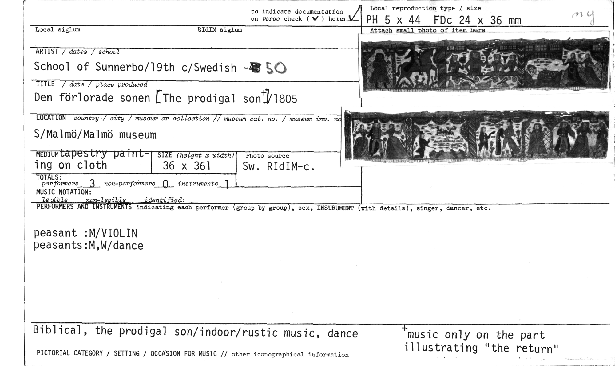 //// to indicate documentation Local reproduction type / size //// on verso check (N/ ) here: PH 5 x 44 FDc 24 x 36 mm //// LOCATION country / city / museum or collection // museum cat. no. / museum tnv. nc //// Local siglum //// RIUM siglum Attach small photo of item here //// TITLE / date / place produced //// Den förlorade sonen [The prodigal son2/1805 //// S/Malmö/Malmö museum //// MEDIUM Lcl pesLry pct ITI I- SIZE (height x width) //// ing on cloth 36 x 361 //// perfbrners___1_ non-performers_Q_ instruments 1 //// Photo source //// Sw. RIdIM-c. //// MUSIC NOTATION: //// le aible non-leaible identified: //// PERFORMERS AND INSTRUMENTS indicating each performer (group by //// peasant :M/VIOLIN peasants:M,W/dance //// group), sex, INSTRUMENT (with details), singer, dancer, etc. //// Biblical, the prodigal son/indoor/rustic music, dance +music only on the part illustrating "the return" //// PICTORIAL CATEGORY / SETTING / OCCASION FOR MUSIC // other iconographical information ////