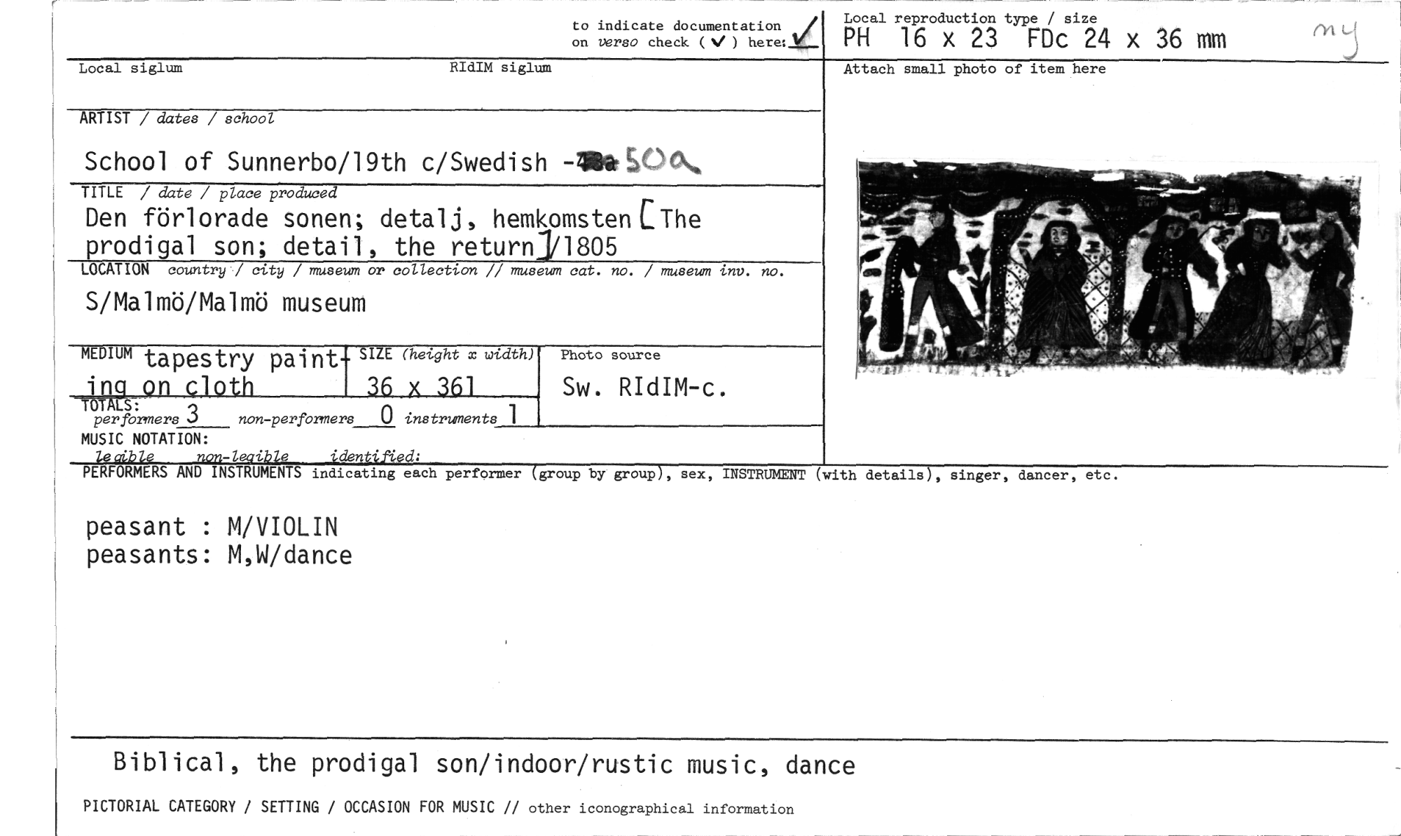 //// to indicate documentation b/I, //// on verso check ) here: //// Local reproduction type / size //// PH 16 x 23 FDc 24 x 36 mm //// Local siglum RIdIM siglum //// ARTIST / dates / school //// School of Sunnerbo/19th c/Swedish -*CO.»5 //// TITLE / date / place produced //// Den förlorade sonen; detalj, hemkomsten CThe //// prodigal son; detail, the returnj/1805 //// LOCATION country / city / museum or collection // museum cat. no. / museum inv. no. //// S/Malmö/Malmö museum //// MEDIUM tapestry pirt- SIZE (height x width) iI1P1 on cloth 36 x 361 //// MALS: g //// performers J non-perPrmers 0 instruments 1 //// Photo source //// Sw. RIdIM-c. //// Attach small photo of item here //// MUSIC NOTATION: //// lecib/e non-telible identilUd: //// PERFORMERS AND INSTRUMENTS indicating each performer (group by group), sex, INSTRUMENT //// peasant : M/VIOLIN peasants: M,W/dance //// (with details), singer, dancer, etc. //// Biblical, the prodigal son/indoor/rustic music, dance //// PICTORIAL CATEGORY / SETTING / OCCASION FOR MUSIC // other iconographical information ////