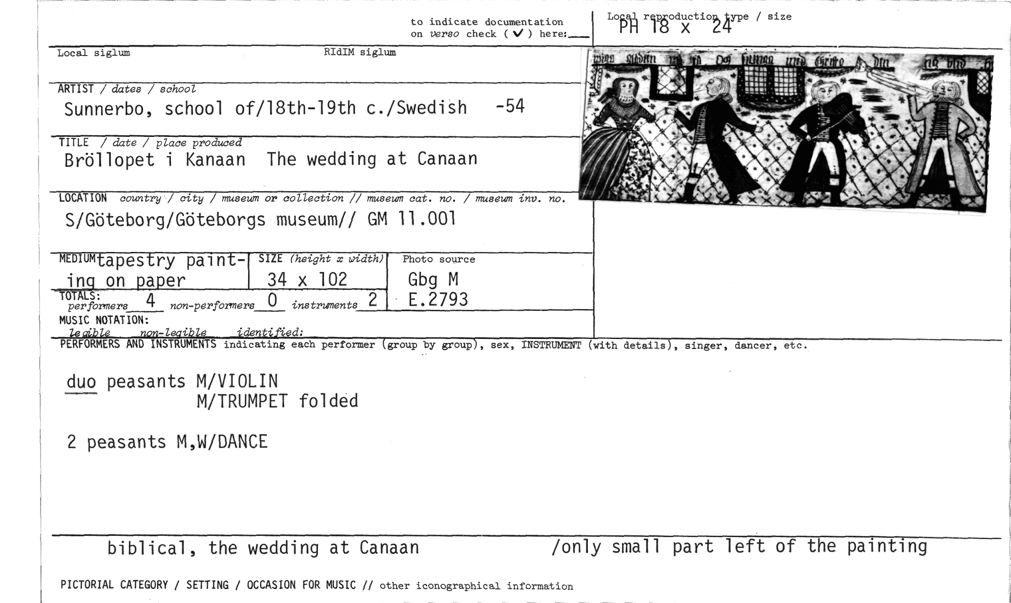 //// duo peasants M/VIOLIN //// M/TRUMPET folded //// 2 peasants M,W/DANCE //// biblical, the wedding at Canaan /only small part left of the painting //// PICTORIAL CATEGORY / SETTING / OCCASION FOR MUSIC // other iconographical information //// to indicate documentation Lon ripäodctiogype / size //// on verso check (%/ ) here:_ //// ARTIST / dates / school //// Sunnerbo, school of/18th-19th c./Swedish -54 //// TITLE / date / place produced //// Bröllopet i Kanaan The wedding at Canaan //// LOCATION country / city / museum or collection // museum cat. no. / museum im,. no. //// S/Göteborg/Göteborgs museum// GM 11.001 //// MEDIM tapestry pai ntinq on paper //// TOTALS //// per forners 4 non-perfbrmers 0 instruments 2 //// MUSIC NOTATION: //// non-leaible identilUd; //// PERFORMERS AND INSTRUMENTS indicating each performer (group by group), sex, INSTRUMENT (with details), singer, dancer, etc. //// SIZE (height x width) //// 34 x 102 //// Photo source //// Gbg M E.2793 ////