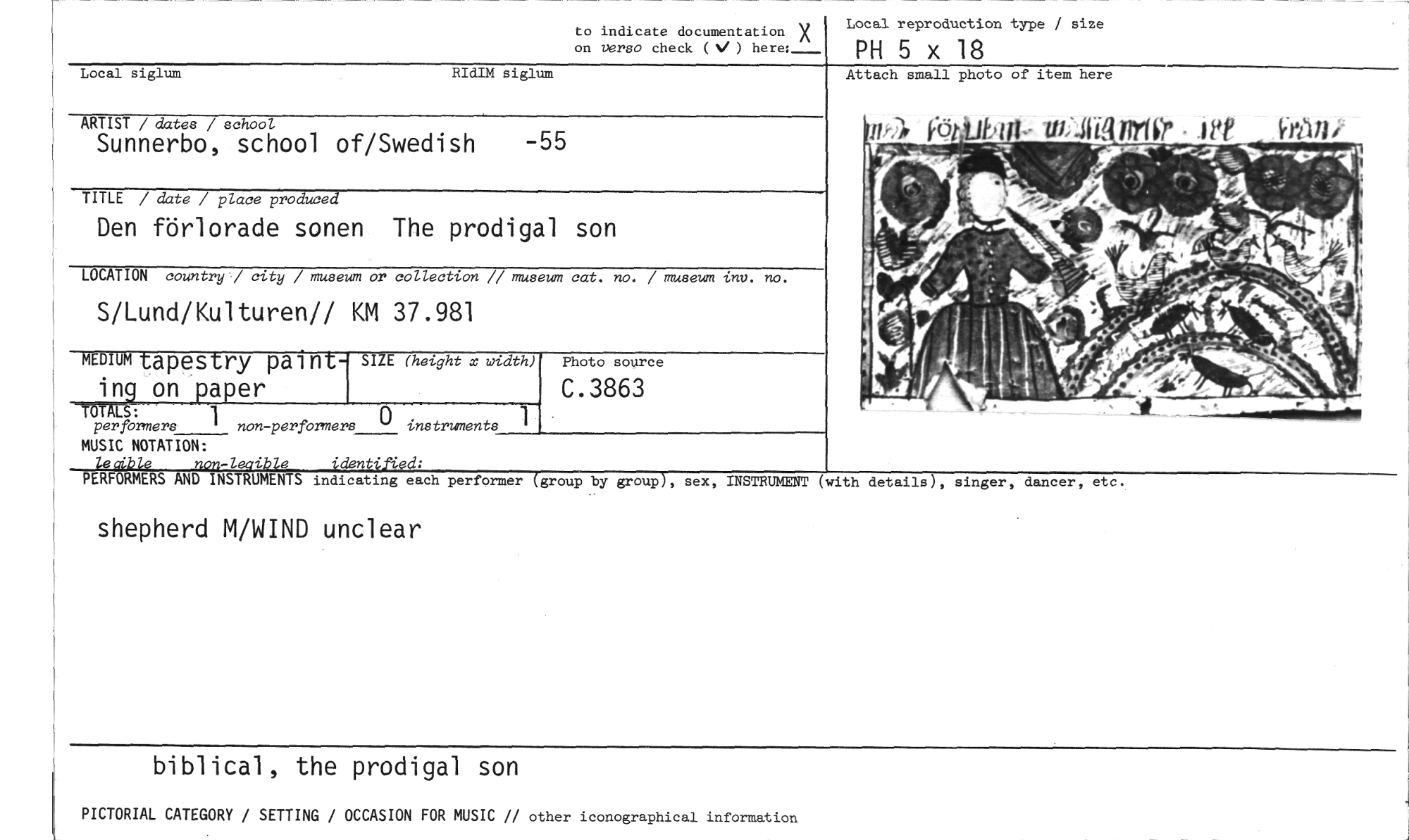 //// to indicate documentation X on verso check (V) here: //// Local reproduction type / size //// PH 5 x 18 //// Local siglum RIdIM siglum //// ARTIST / dates / school //// Sunnerbo, school of/Swedish -55 //// TITLE / date / place produced //// Den förlorade sonen The prodigal son //// LOCATION country / city / museum or collection // museum cat. no. / museum tnv. no. //// S/Lund/Kulturen// KM 37.981 //// MEDIUM tapestry paint- SIZE (height x width) //// ing 9 on paper //// - //// TOTA[ //// per formers 1 ' non-performers ° instruments //// Photo source //// C.3863 //// Attach small photo of item here //// MUSIC NOTATION: //// lecible non-legible identified: //// PERFORMERS AND INSTRUMENTS indicating each performer (group by group), sex, INSTRUMENT //// shepherd M/WIND unclear //// (with details), singer, dancer, etc. //// biblical, the prodigal son //// PICTORIAL CATEGORY / SETTING / OCCASION FOR MUSIC // other iconographical information ////