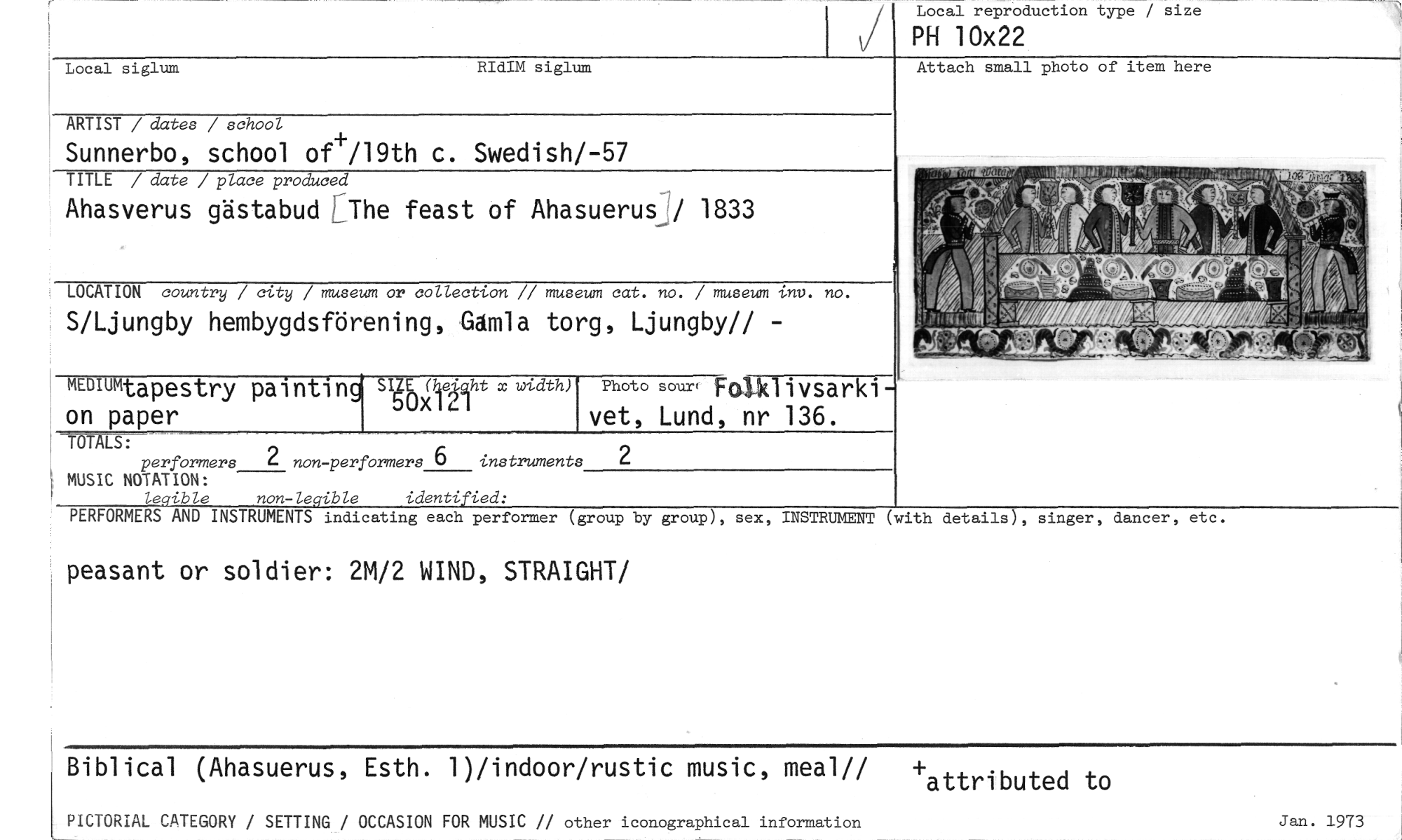 //// Local reproduction type / size //// PH 10x22 //// Attach small photo of item here //// Local siglum RIdIM siglum //// ARTIST / dates / school //// Sunnerbo, school of+/19th c. Swedish/-57 //// TITLE / date / place produced //// Ahasverus gästabud [The feast of Ahasuerus / 1833 //// LOCATION country / city / museum or collection // museum cat. no. / museum /ila,. no. //// S/Ljungby hembygdsförening, Gåmla torg, Ljungby// - //// MEDIUMta pestry painting on paper SIE (åei.aht x width) Photo cour, Folklivsarki- //// 50x121 vet, Lund, nr 136. //// //// TOTALS: performers 2 non-parformers 6 instruments 2 //// MUSIC NOTATION: //// legible non-leqible identified: //// PERFORMERS AND INSTRUMENTS indicating each performer (group by group), sex, INSTRUMENT (with //// peasant or soldier: 2M/2 WIND, STRAIGHT/ //// details), singer, dancer, etc. //// Biblical (Ahasuerus, Esth. 1)/indoor/rustic music, meal// attributed to //// PICTORIAL CATEGORY / SETTING / OCCASION FOR MUSIC // other iconographical information //// Jan. 1973 ////